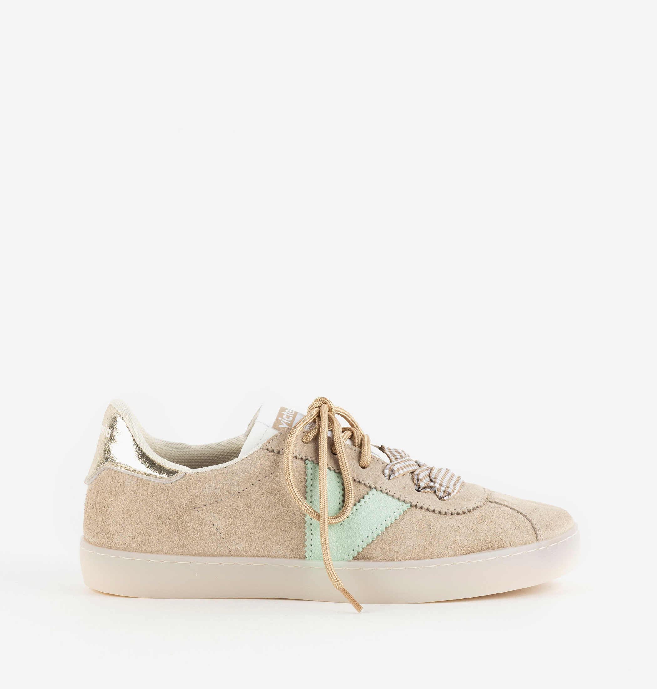 Sneaker für Damen, hergestellt in Spanien aus Veloursleder. Seitliches victoria-"V" im Kontrast und metallisches Fersenteil. Geschlossen mit doppelten Schnürsenkeln – ein Paar breite, kariert gemusterte und ein weiteres rundes, tonales Paar. Durchsichtige TR-Sohle.
