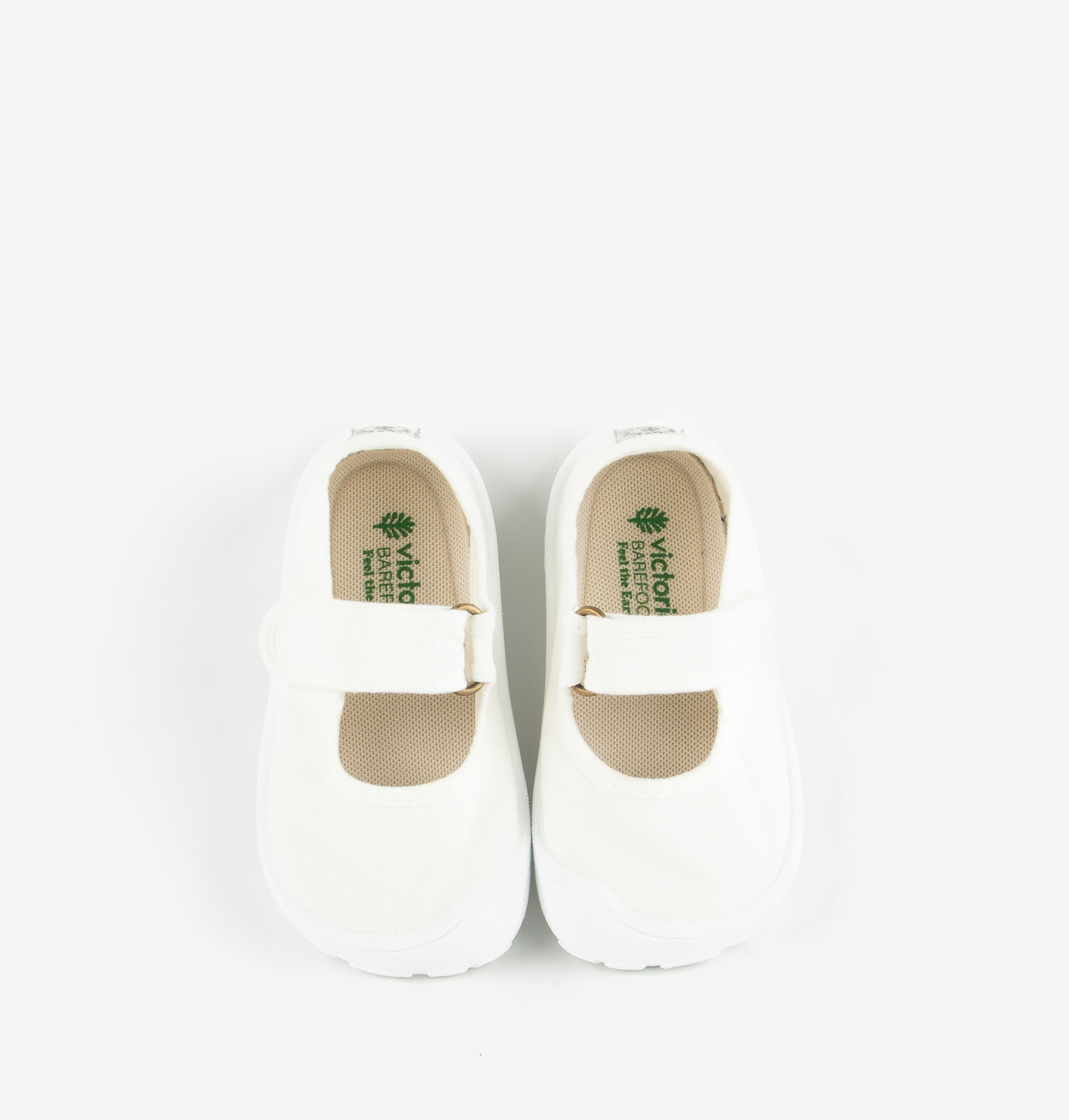 Kinder-Barefoot-Mary Janes aus Canvas, hergestellt aus einer Kombination von recycelter DREC®-Baumwolle (Dyeable Recycled Eco Cotton) und Bio-Baumwolle, die in Spanien angebaut, gesponnen und gewebt wird. Verschluss mit Klettriemen für eine einfache und sichere Passform. Weiße, flexible TR-Sohle.