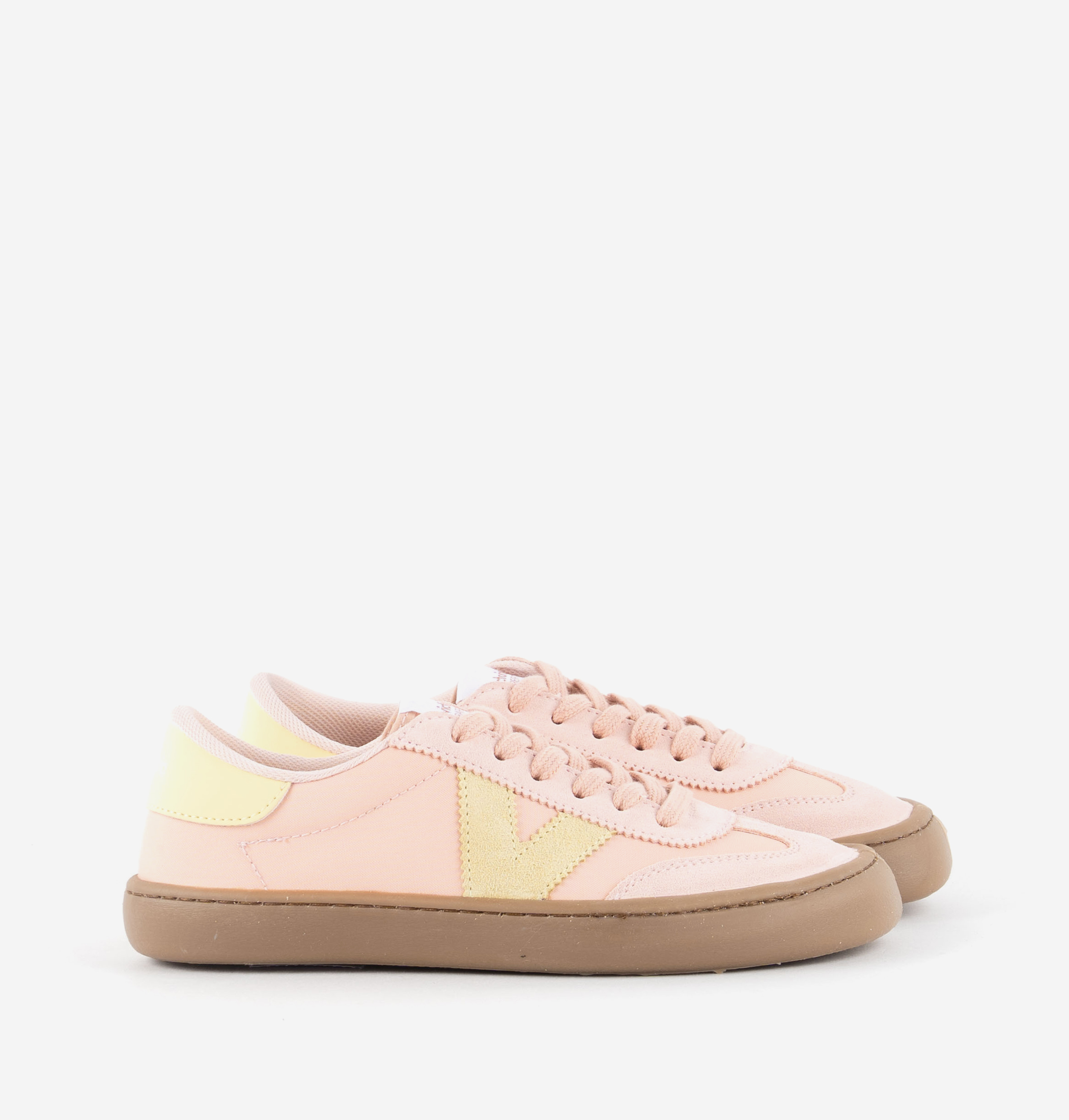 Hergestellt in Spanien aus Nylon mit pastellfarbenen Elementen in Leder- und Velourslederoptik. Das seitliche victoria-"V" und das Fersenteil setzen harmonische Farbakzente im Kontrast. Flexible TR-Sohle in Karamellfarbe.