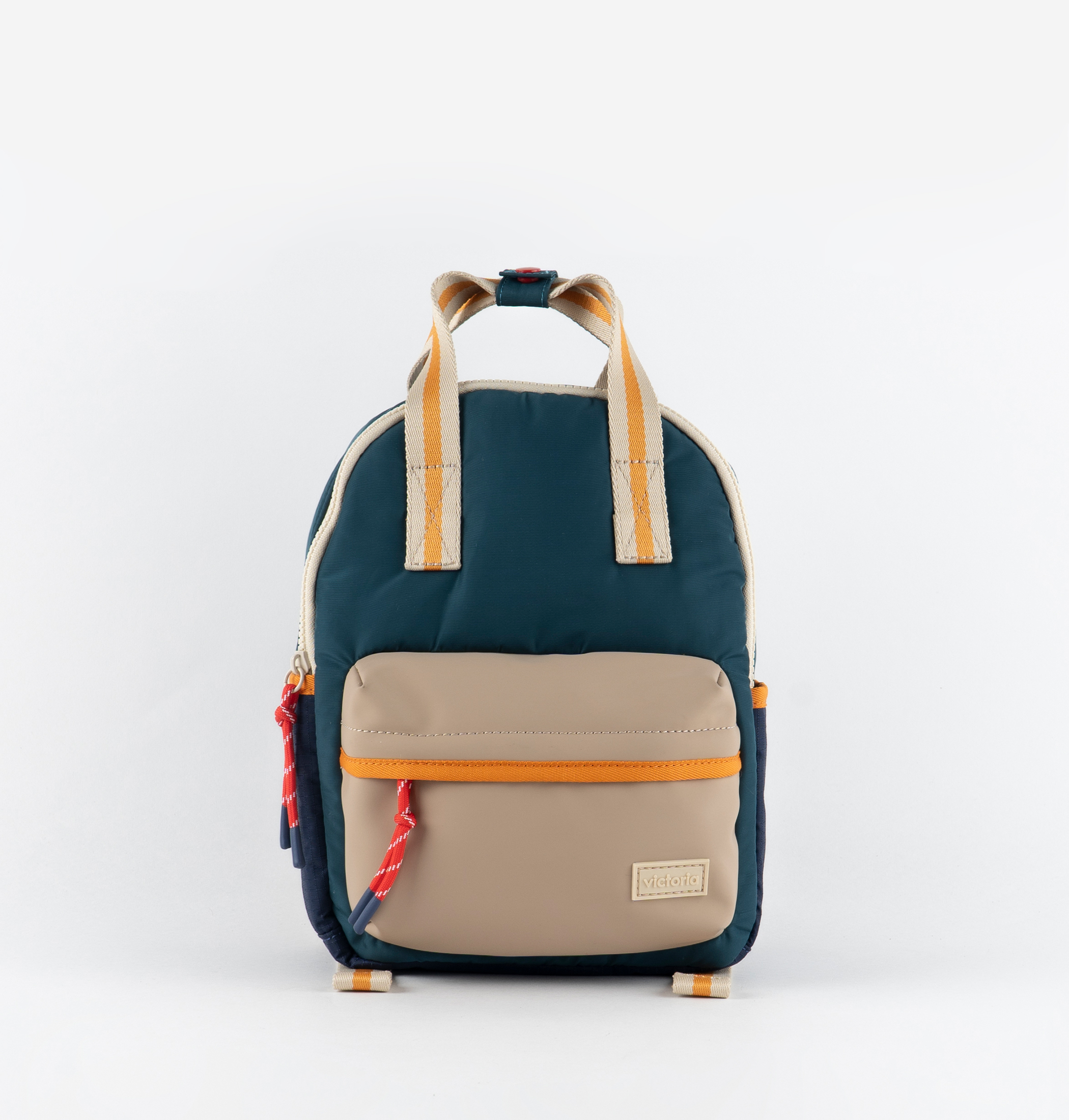 Kinder-Rucksack aus mehrfarbigem Nylon. Öffnung mit Reißverschluss und Kordelzug als Zipper. Innen gefüttert mit Taschen. Großer Frontaußentasche mit Reißverschluss und Kordelzug, dazu zwei Seitentaschen. Innenfutter farblich passend. Bicolore Tragegurte, verstellbar, verstärkt und mit Sicherheitsclip.