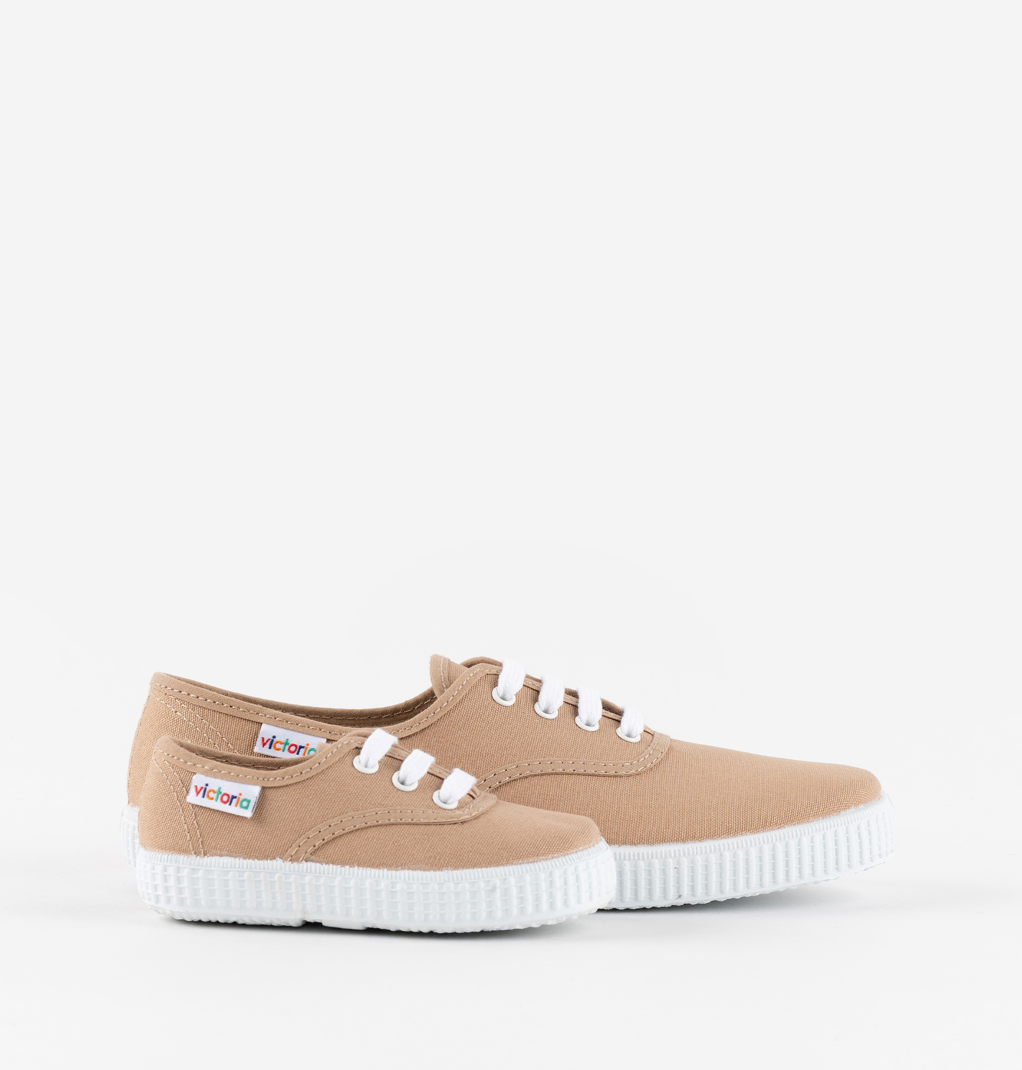These canvas trainers are available in all sizes and made from eco-friendly cotton that's grown, spun and woven in Spain. Featuring a distinctive multicoloured victoria logo label stitched on the side. White lace-up fastening. Flexible vulcanised natural rubber sole.