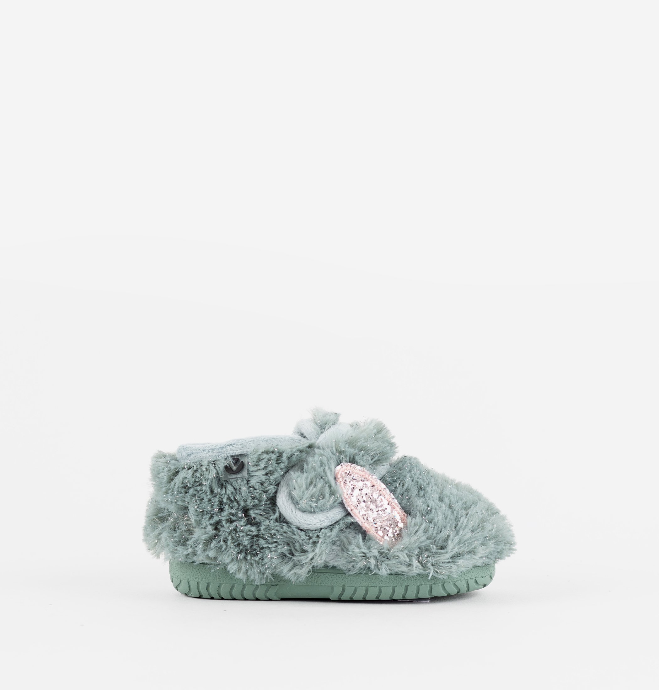 Closed slippers with lurex fur and cute little ears for girls. The hook-and-loop closure makes them easy to put on and take off, fostering autonomy. Tone-on-tone vulcanized rubber sole.