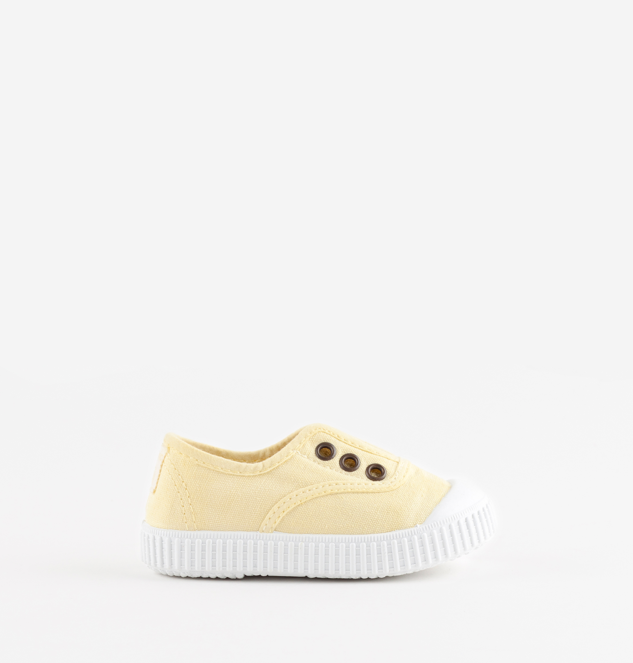 Our kids' slip-on canvas shoes are made in a unique combination of DREC® (Dyeable Recycled Eco Cotton) and organic cotton cultivated, spun and woven in Spain. They have a vulcanised natural rubber sole that provides durability and flexibility, while the rubber reinforcement at the toe offers additional strength. Central elastic on the upper, making it easier for kids to get them on and off, promoting independence. They come with removable insoles for added comfort and easy washing.