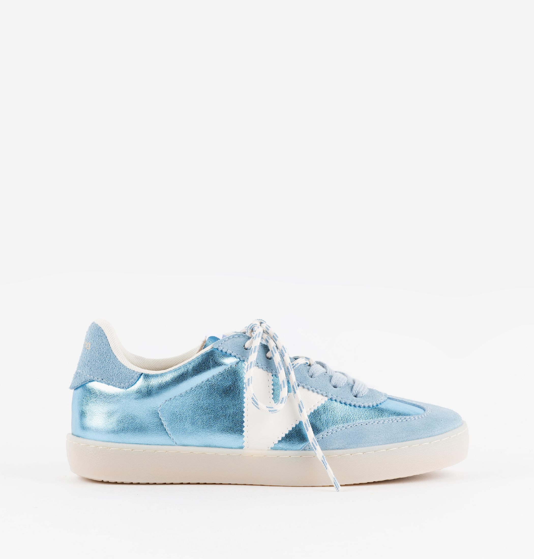 Women's trainers made in Spain from metallic-effect faux leather with matching suede overlay panels. Contrasting white side victoria "V". Double lace-up fastening: one white pair and one round pair with matching print. Translucent T.R. sole.