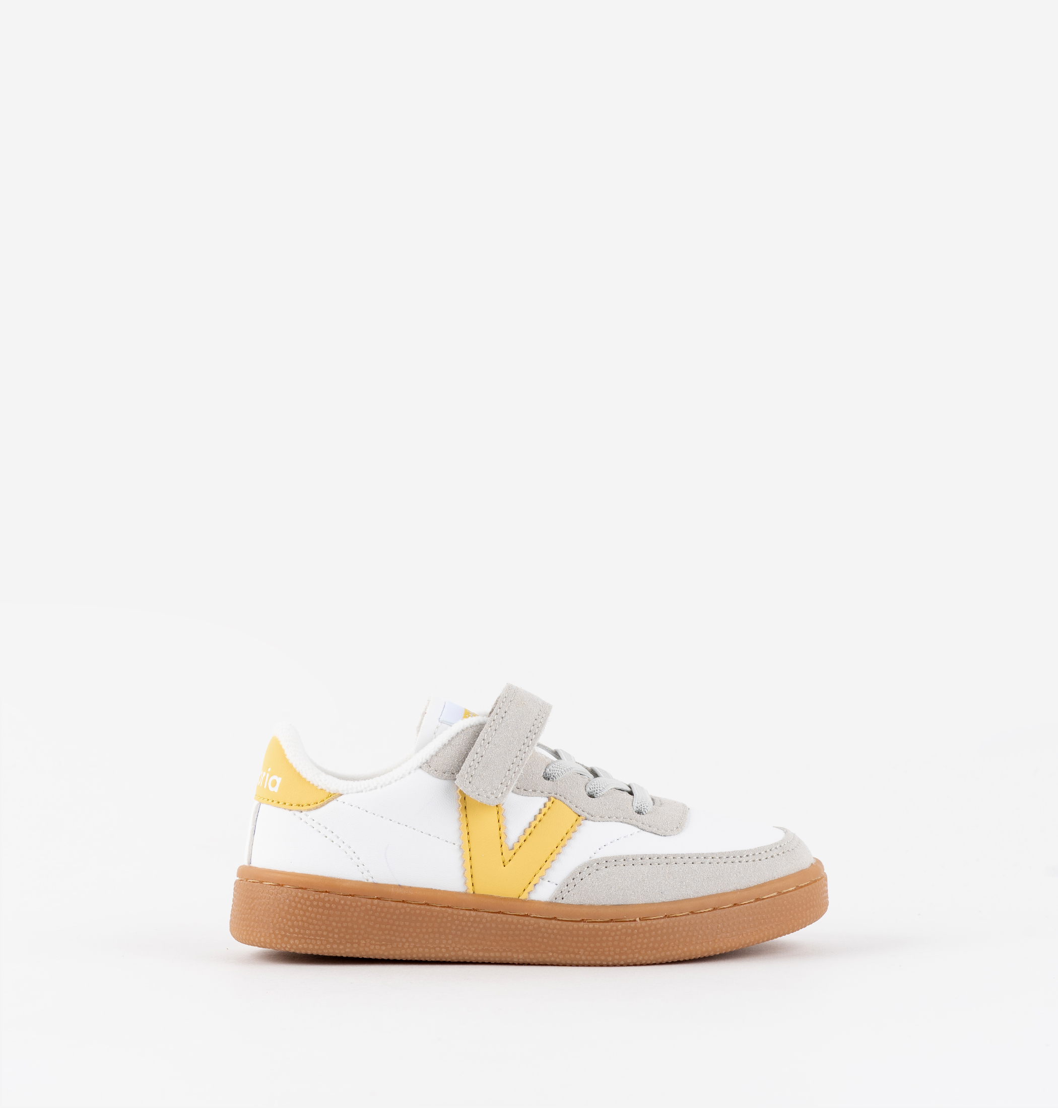 Kids' trainers made from white faux leather with suede-effect panels. Coloured detail on the side victoria "V" matching the heel panel, which features the brand logo embossed in white. Elastic lace-up fastening with an additional hook-and-loop strap for easy fitting and extra support, encouraging independence. Comfortable caramel-coloured TPR sole.