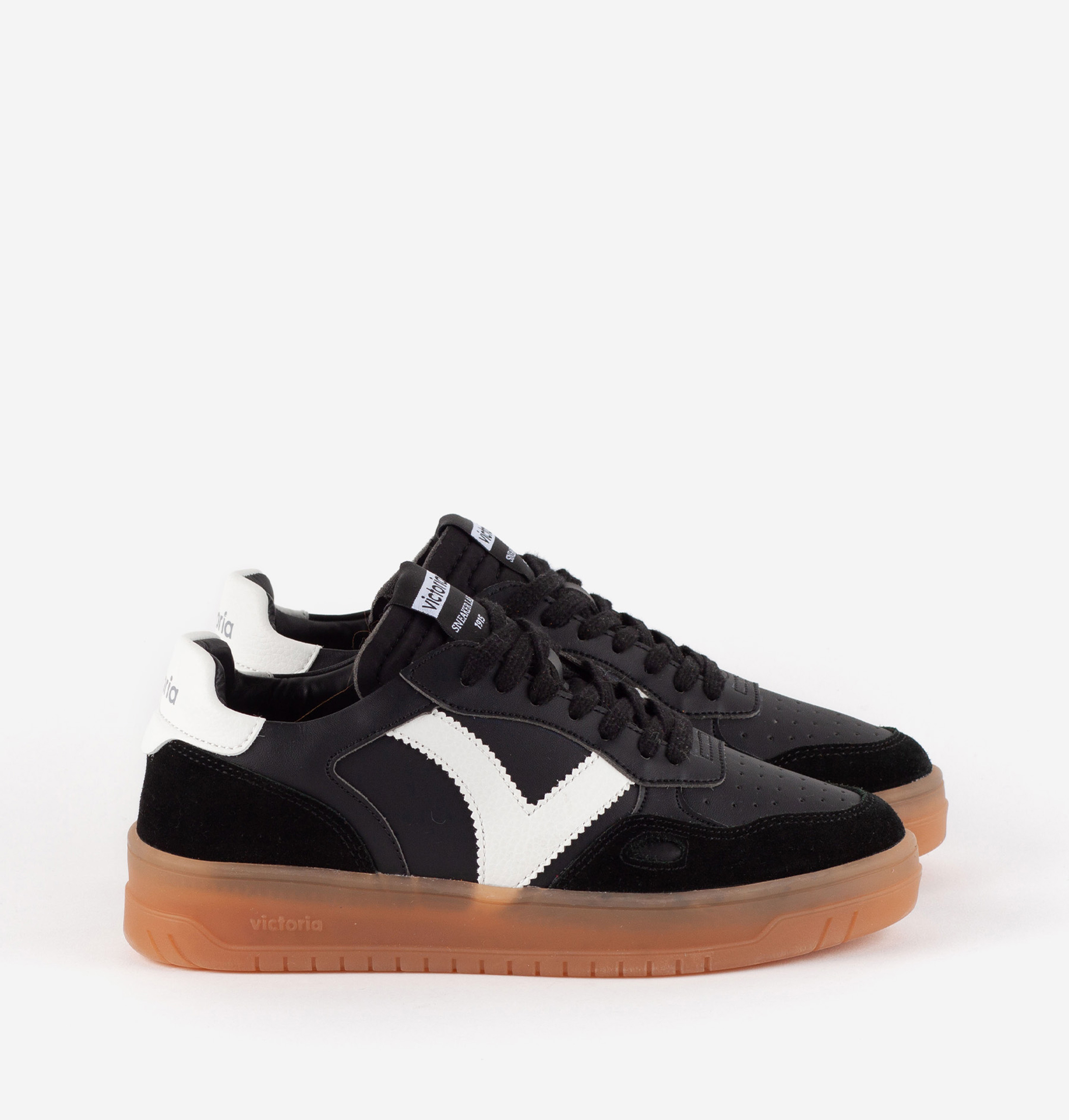 Unisex trainers made from faux leather with suede panels. Side victoria "V" and heel panel featuring the brand logo embossed in contrast. Matching lace-up fastening. Side window-shaped detail. Perforated toe cap to enhance breathability. Caramel-coloured TPR sole.