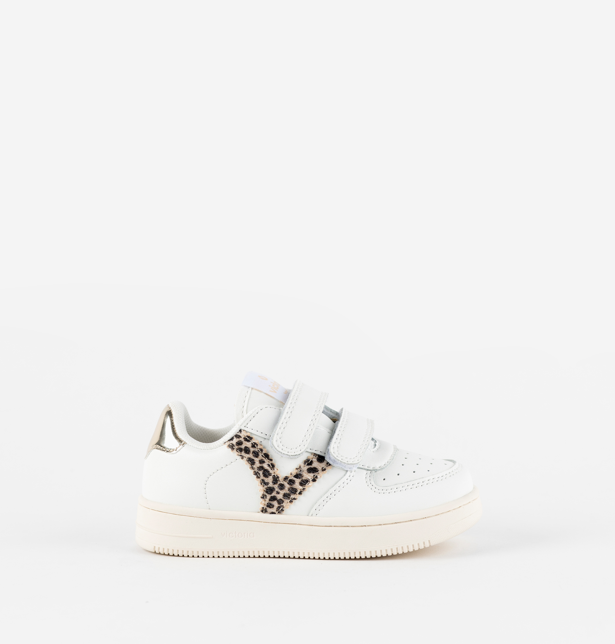 White faux leather trainers for girls. Side victoria "V" and heel panel in combinations of glitter and animal print. Hook-and-loop fastening (two straps up to size 35 and three from size 36) for better support and easy fitting, encouraging independence. Comfortable TPR sole and perforated toe cap for improved breathability.