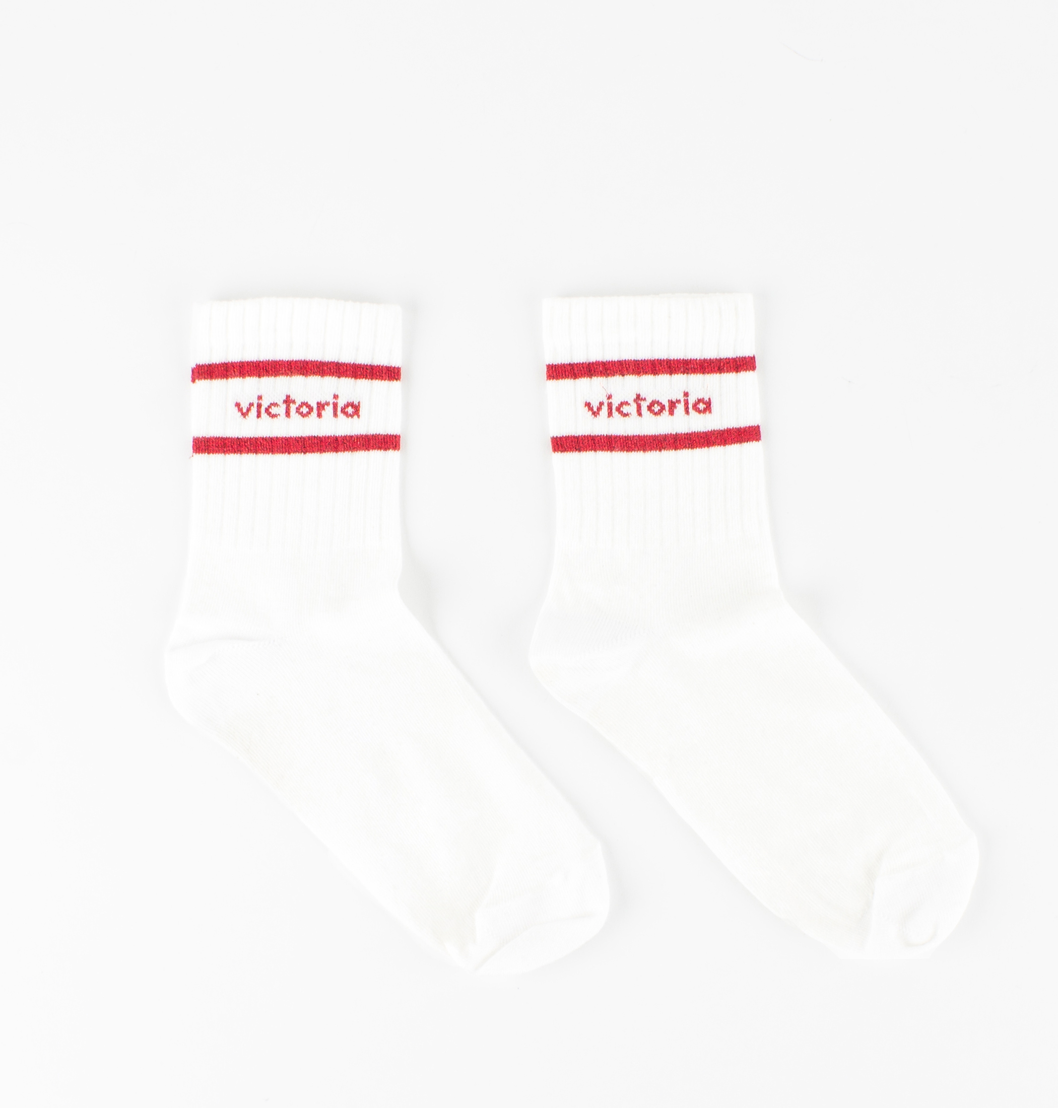 Cotton sock with an off-white base thread. Stripe and logo detail in shiny thread. Knitted in a ribbed effect.