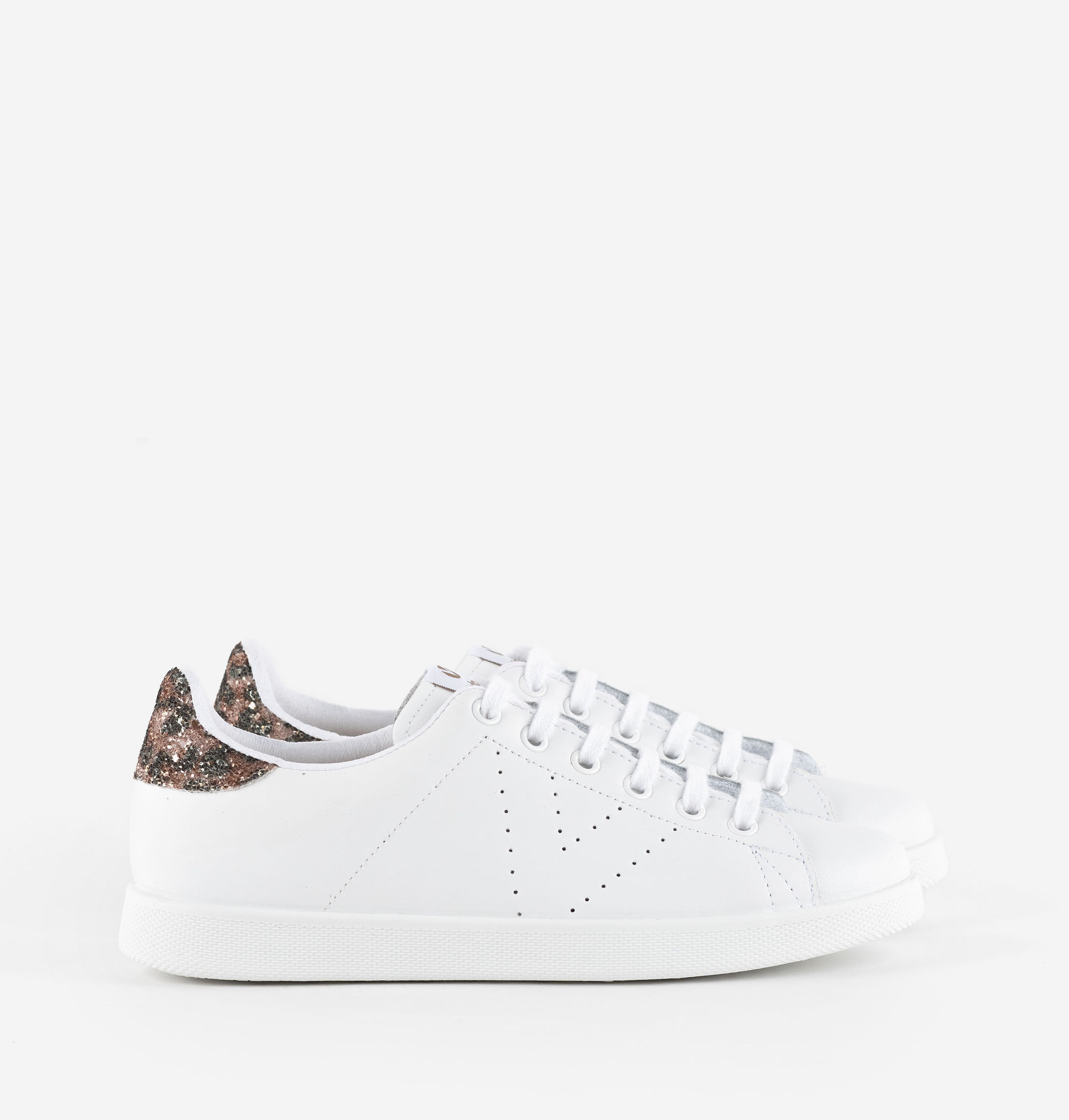 White tennis-style trainers for women and girls, made in Spain from high-quality leather. Perforated side victoria "V" and glitter heel panel. Comfortable PVC sole made with vegetable oils instead of minerals, helping to reduce environmental impact.