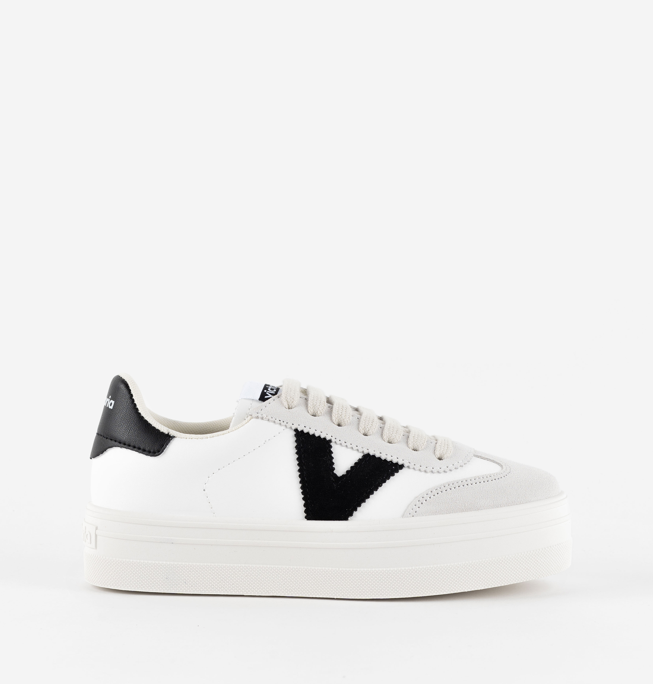Platform trainers for women. Made in Spain from white faux leather with suede details (new cyclist cut on the toe). Side victoria "V" and back panel in matching contrasting colours. Comfortable 4 cm PVC sole made with vegetable oils instead of minerals, helping to reduce environmental impact.