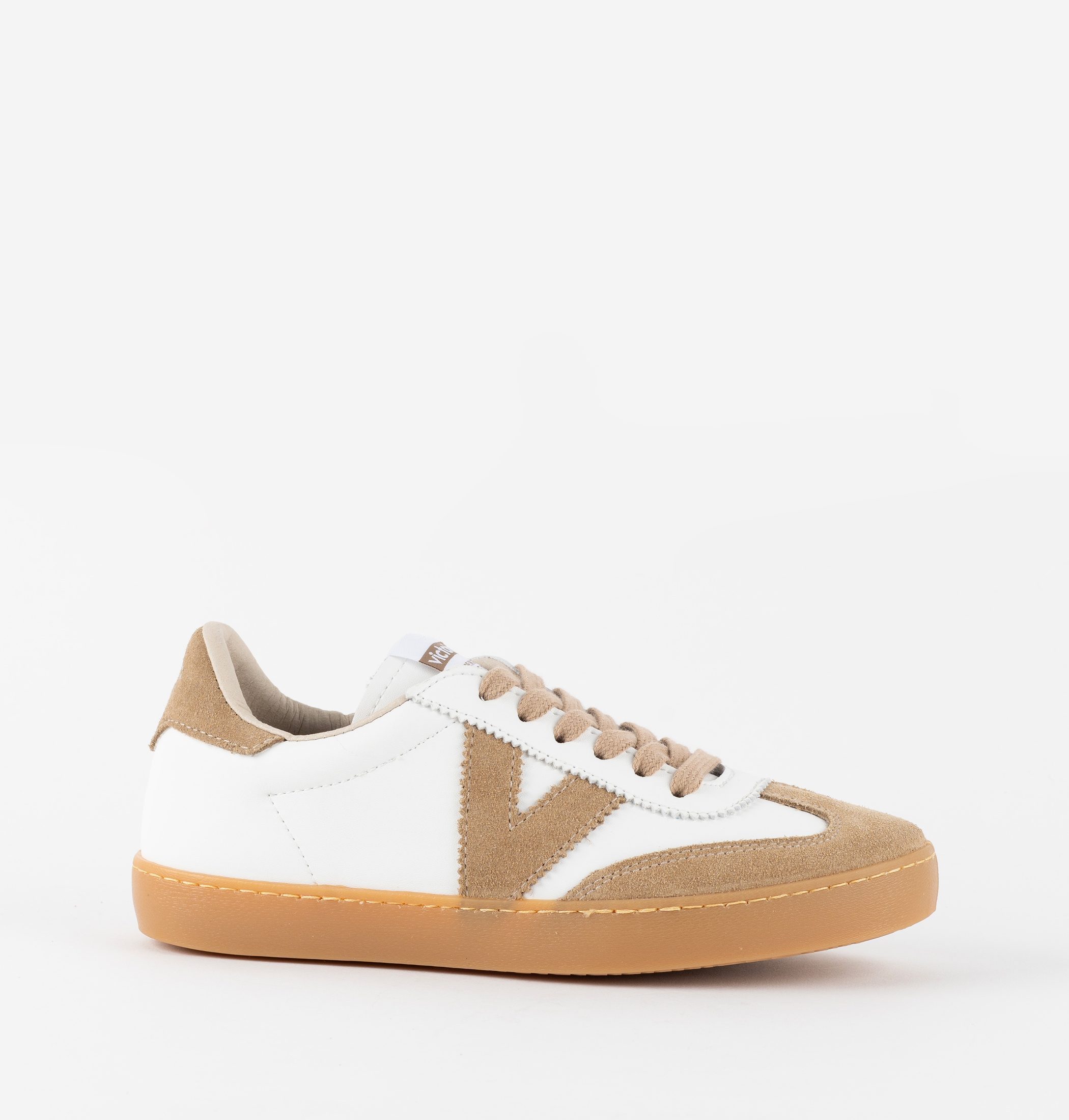 Unisex trainers made in Spain from white faux leather with suede panels. Side victoria "V", toe cap and heel panel in matching contrasting colours. Matching lace-up fastening. Translucent caramel-coloured T.R. sole.