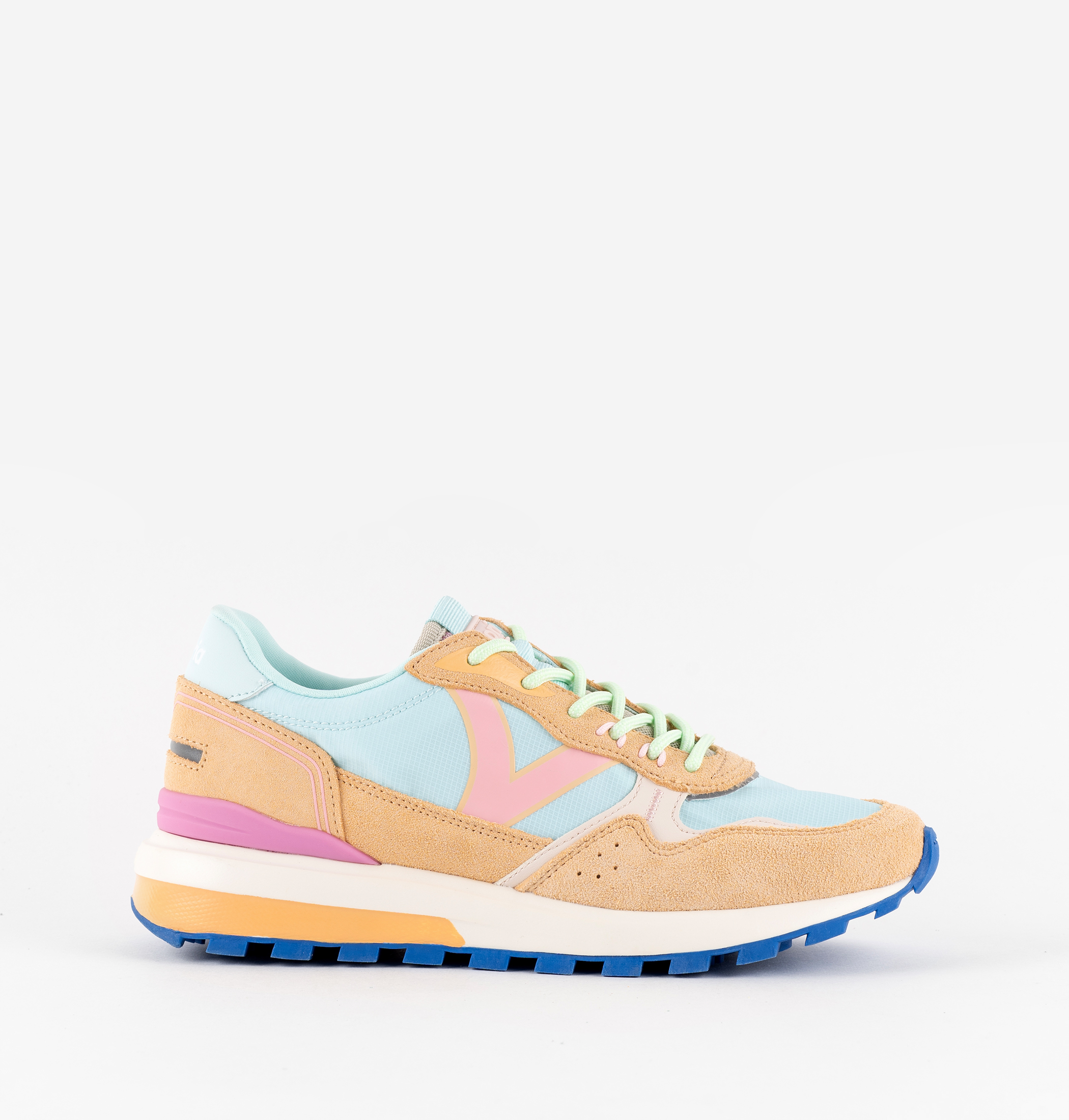Made from nylon with multicoloured suede and synthetic overlay panels. Thermo-adhesive TPU side victoria "V". Rubber patch with the brand logo on the tongue. Colourful round lace-up fastening. Comfortable phylon sole with embossed fluorescent TPR tread and heel stabiliser.