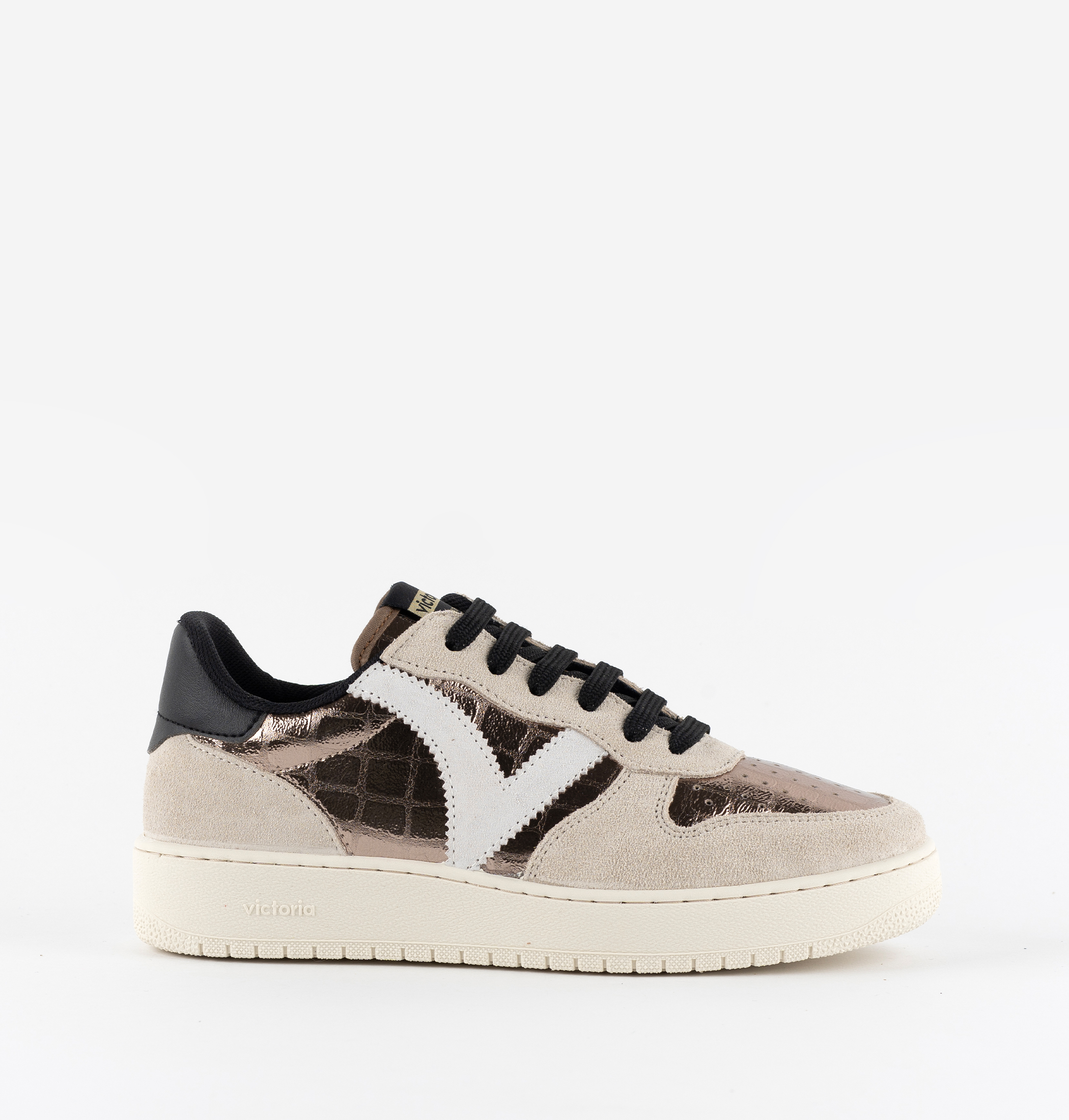 Women's sports sneakers made in Spain from metallic leather-effect material combined with suede and synthetic pieces. Side V and heel piece in contrasting black and white colors. 3 cm sole made with vegetable oils instead of mineral oils, reducing environmental impact. Lightweight, comfortable, and breathable.
