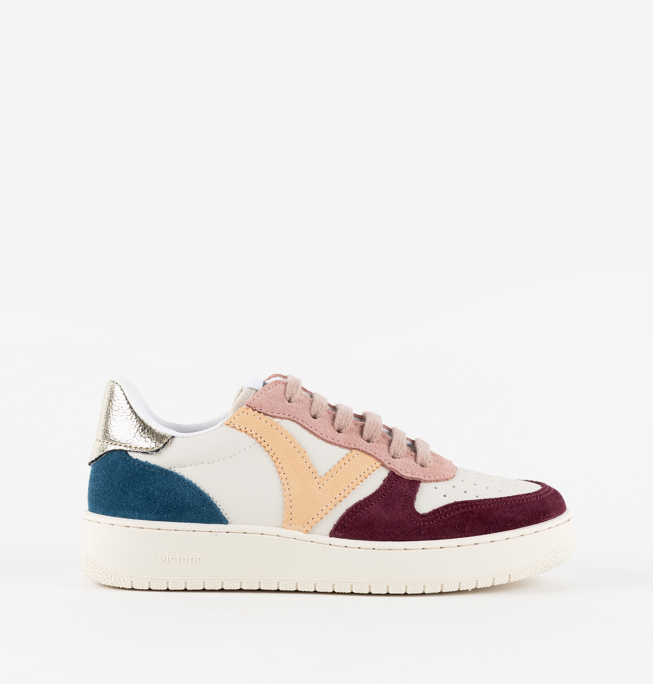 Women's sneakers made in Spain from leather-effect material and multicolor suede pieces. Retro V on the side and metallic detail on the heel piece. 3 cm sole made with vegetable oils instead of mineral oils, reducing environmental impact. Lightweight, comfortable, and breathable.