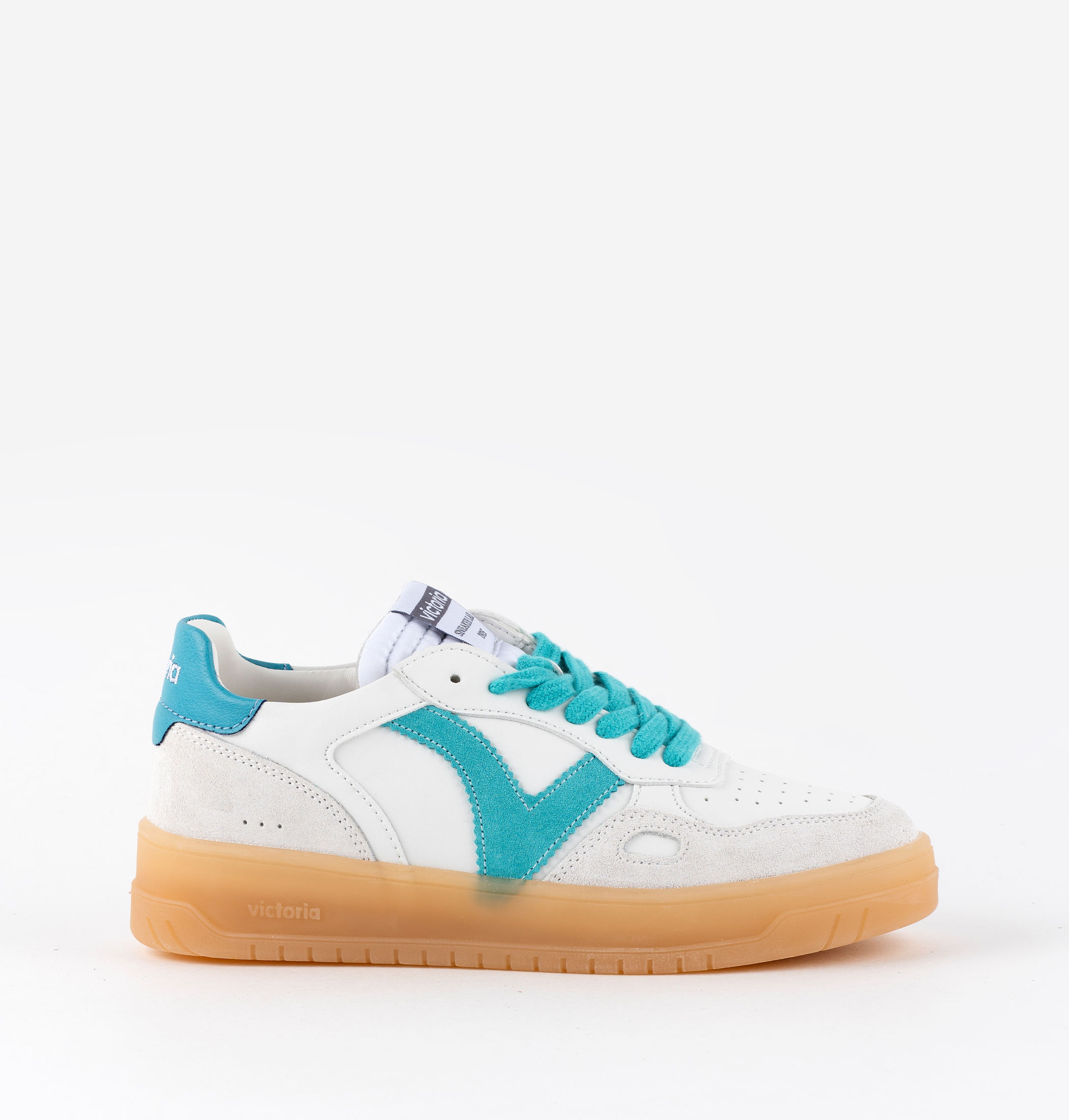 Unisex trainers made from white faux leather with coloured and suede panels. Contrasting side victoria "V" and heel panel in matching tones, featuring the brand logo embossed in white. Lace-up fastening matching the coloured panels. Side window-shaped detail. Perforated toe cap to enhance breathability. Caramel-coloured TPR sole.