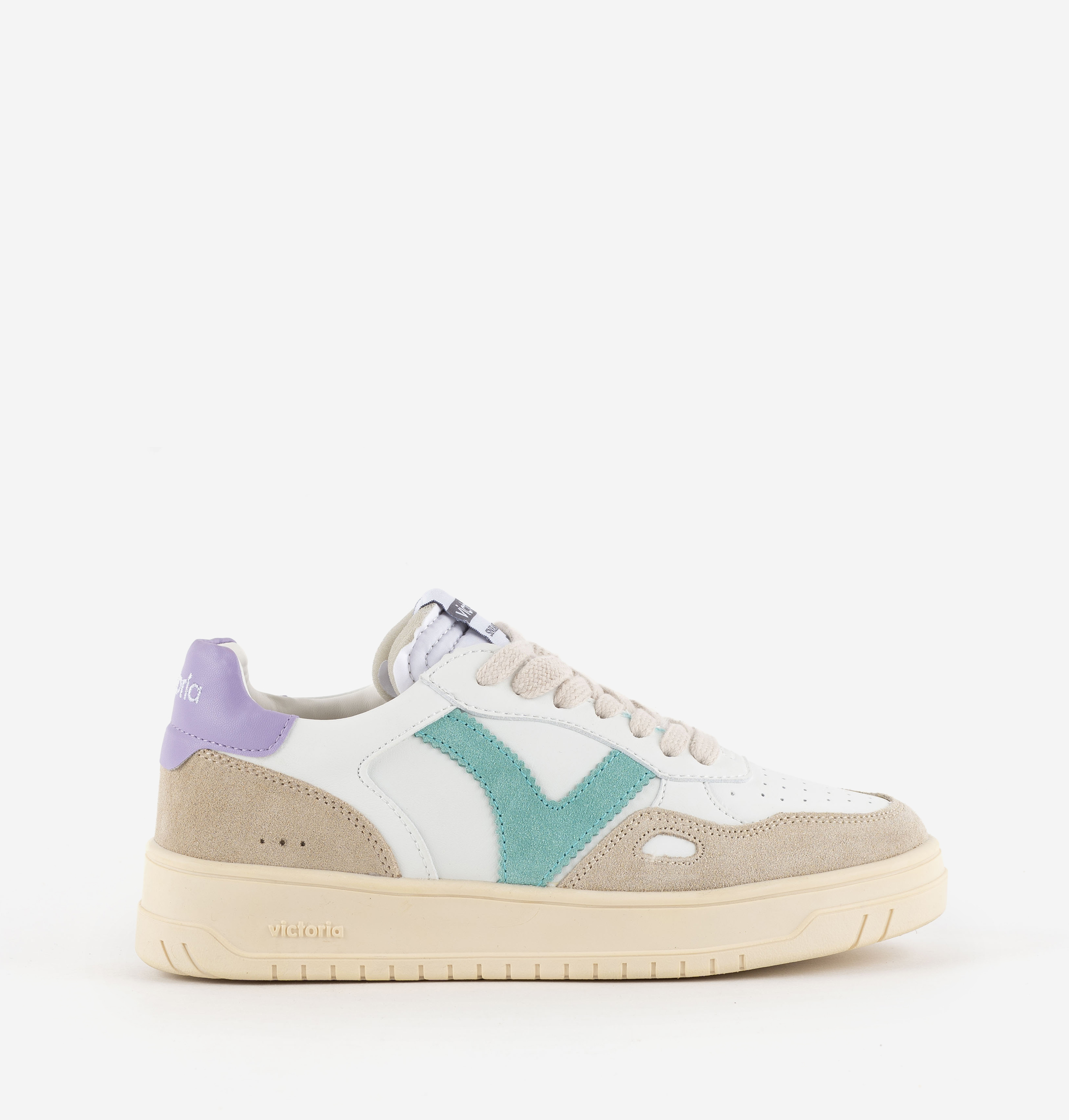 White unisex sports sneakers made of leather-effect material and suede pieces. Colored details on the lateral V and on the heel tab with the brand logo. Window detail on the side. Slightly toasted 3.5 cm sole. They include a removable padded insole for added comfort.