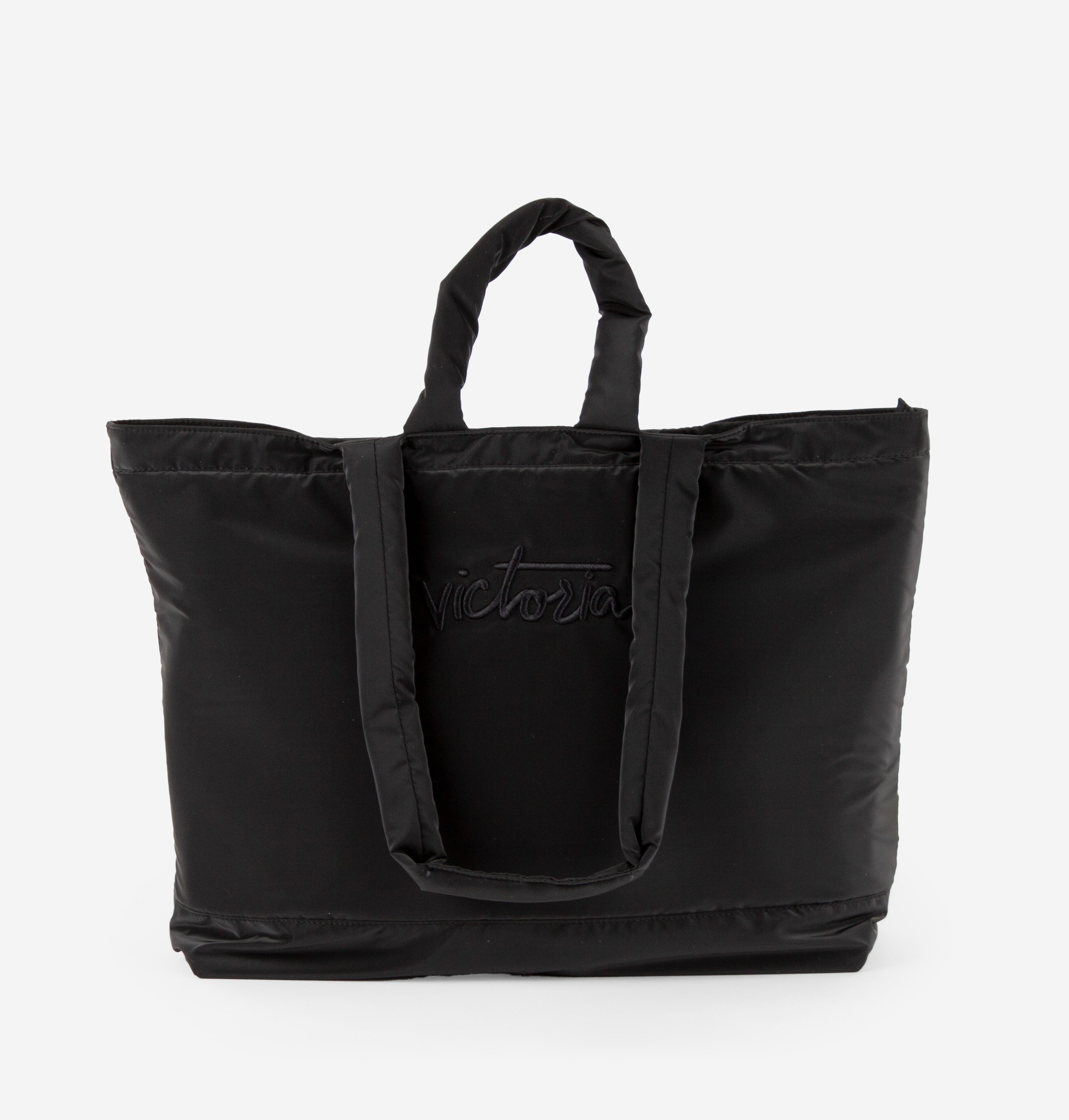 Soft and padded metallic-effect bag. Double handles and zip closure. Three interior pockets, one of them with a zipper. Embroidered tone-on-tone detailing and a silicone label with a fluorescent touch.