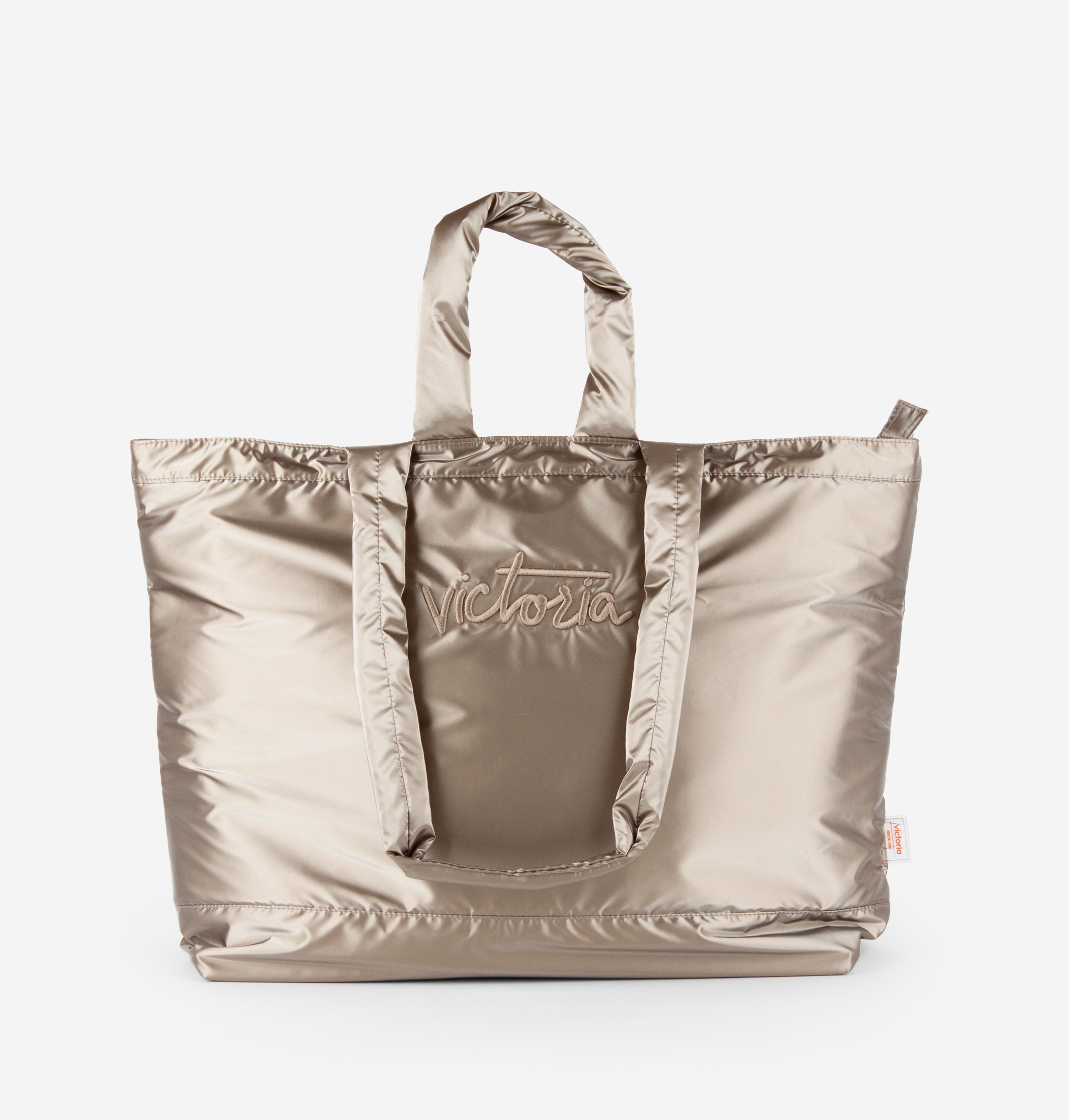 Soft and padded metallic-effect bag. Double handles and zip closure. Three interior pockets, one of them with a zipper. Embroidered tone-on-tone detailing and a silicone label with a fluorescent touch.