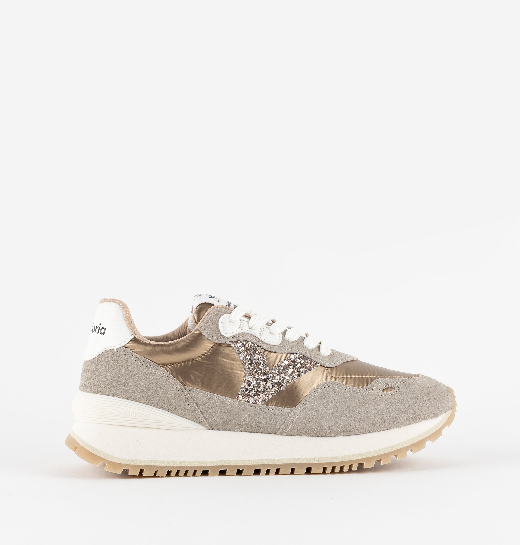 Sneakers for women made from nylon with a metallic finish and quilted effect, combined with tone-on-tone suede panels. Side V in glitter and white heel piece with brand logo. Their lightness and sporty character are enhanced by details such as the wide sole and heel stabilizer.