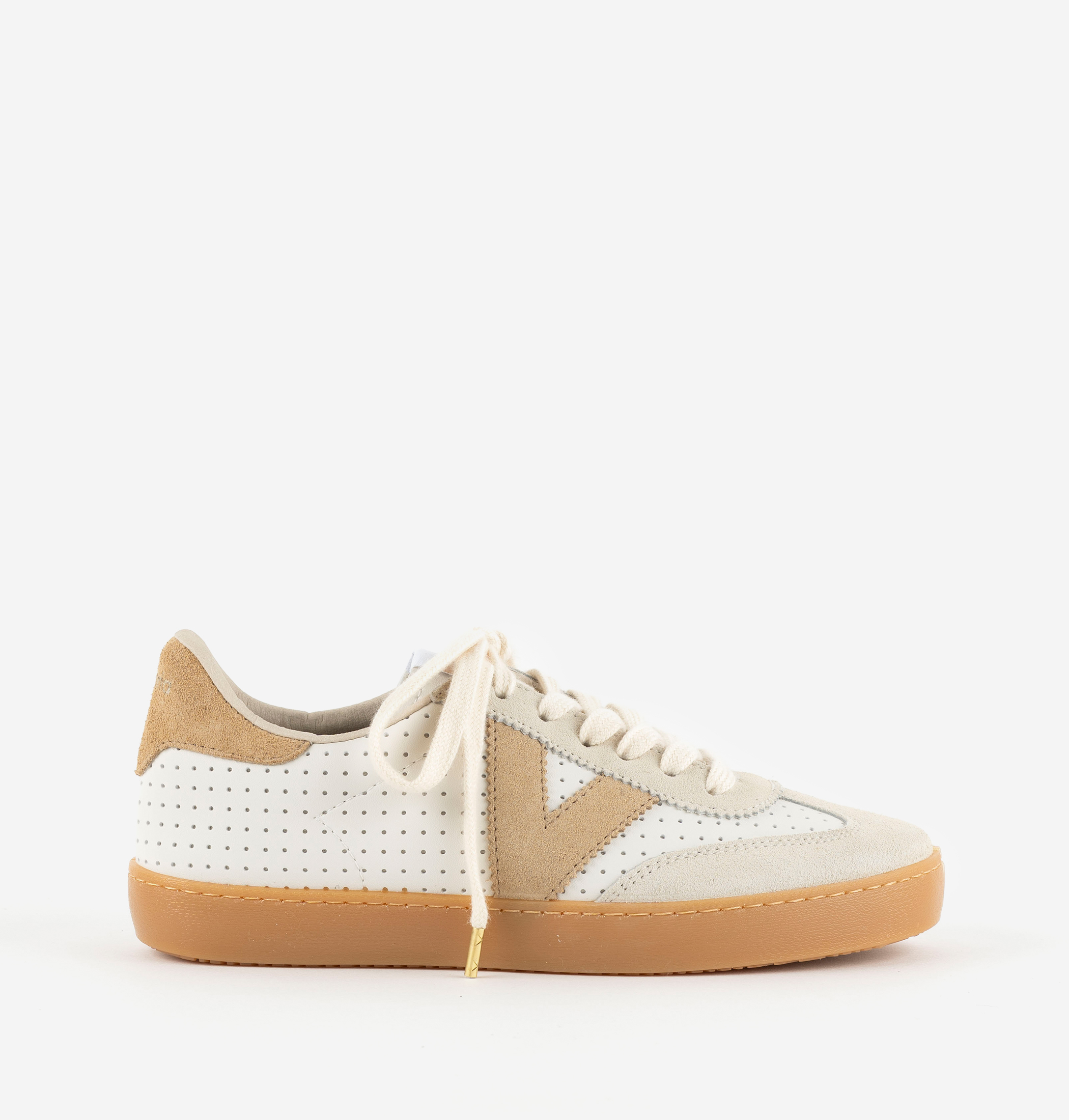 Unisex trainers made in Spain from white micro-perforated faux leather with suede panels. Side victoria "V" and heel panel in matching contrasting colours. Translucent caramel-coloured T.R. sole.