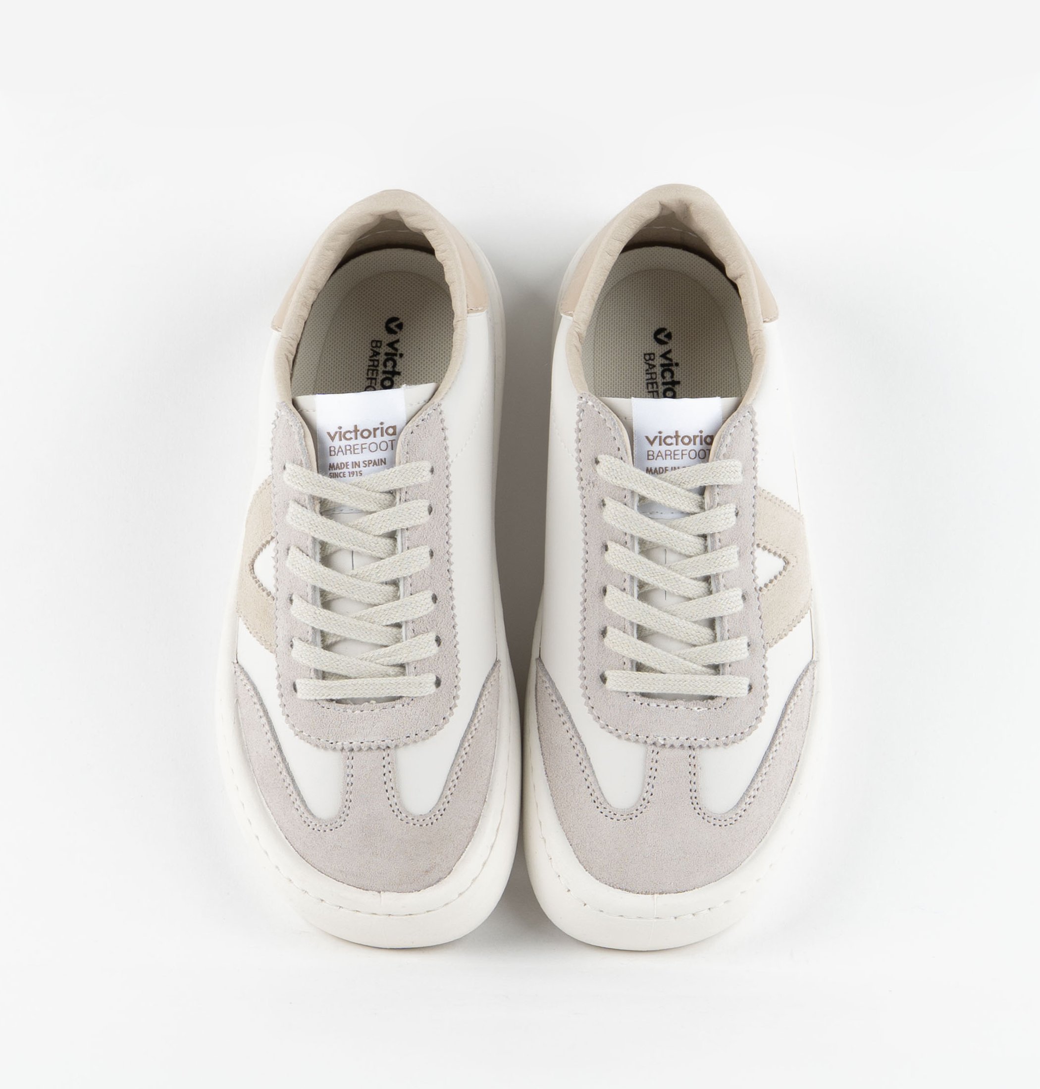 Made in Spain from white faux leather with coloured and suede panels. The side victoria "V" and heel panel contrast in matching tones. Flexible PVC sole made with vegetable oils instead of minerals, helping to reduce environmental impact.