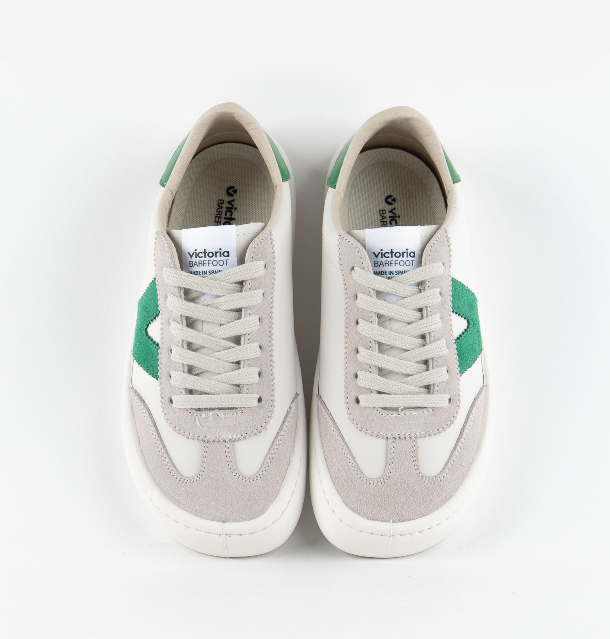 Made in Spain from white faux leather with coloured and suede panels. The side victoria "V" and heel panel contrast in matching tones. Flexible PVC sole made with vegetable oils instead of minerals, helping to reduce environmental impact.