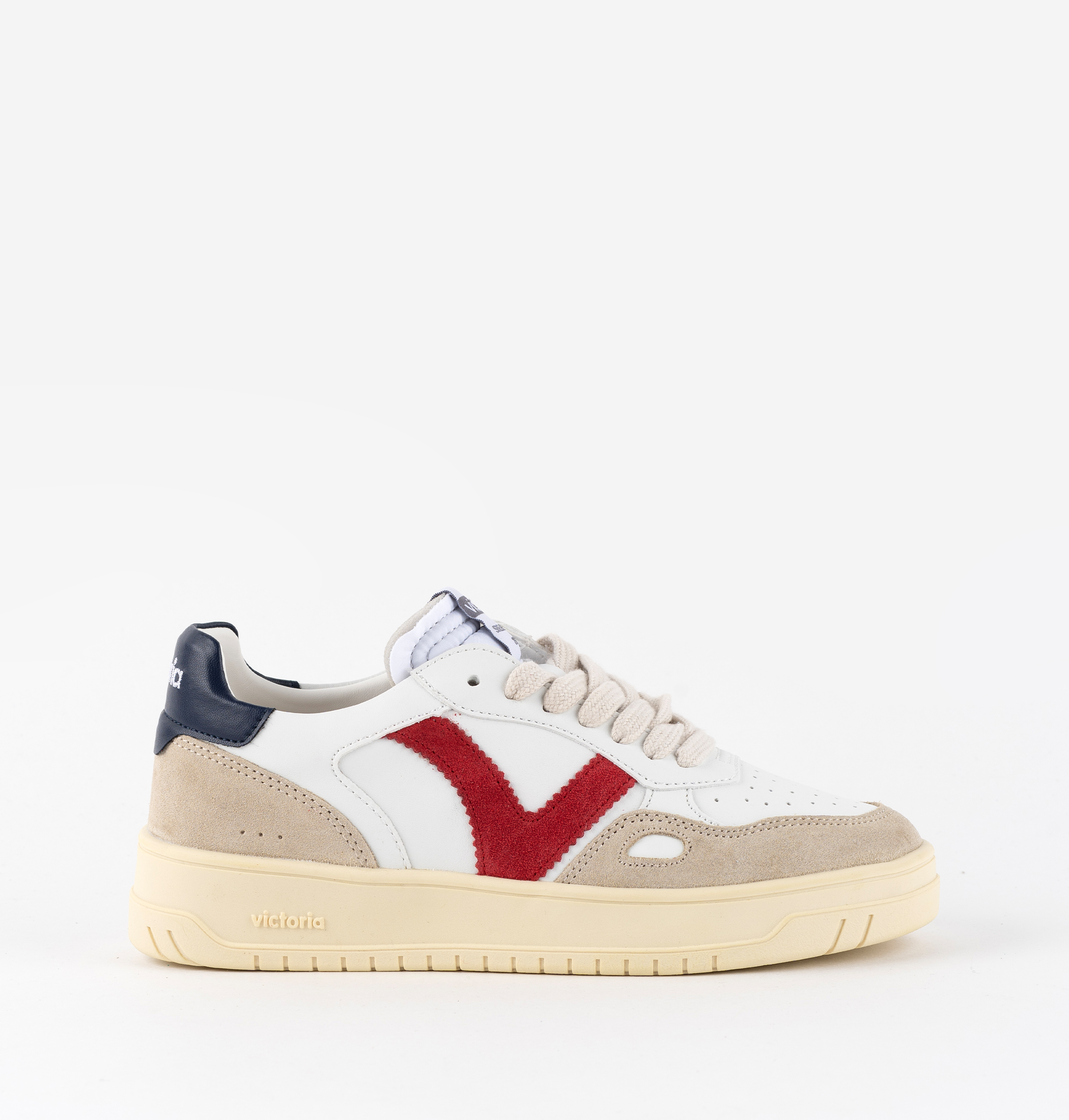 Unisex trainers made from white faux leather with suede panels. Coloured detail on the side victoria "V" and heel panel, which features the brand logo embossed in white. Side window-shaped detail. Perforated toe cap to enhance breathability. Slightly toasted TPR sole.