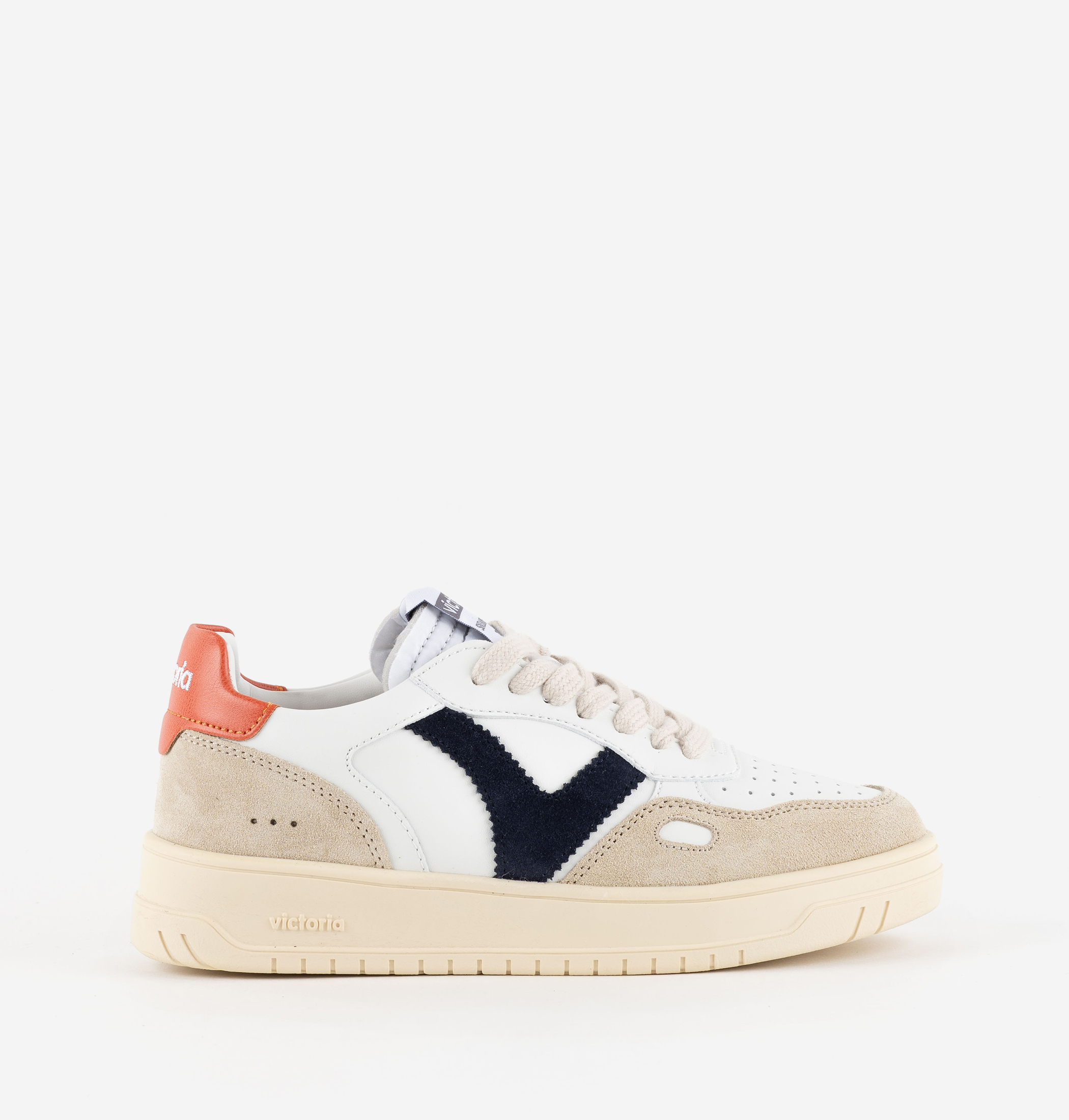 Unisex trainers made from white faux leather with suede panels. Coloured detail on the side victoria "V" and heel panel, which features the brand logo embossed in white. Side window-shaped detail. Perforated toe cap to enhance breathability. Slightly toasted TPR sole.