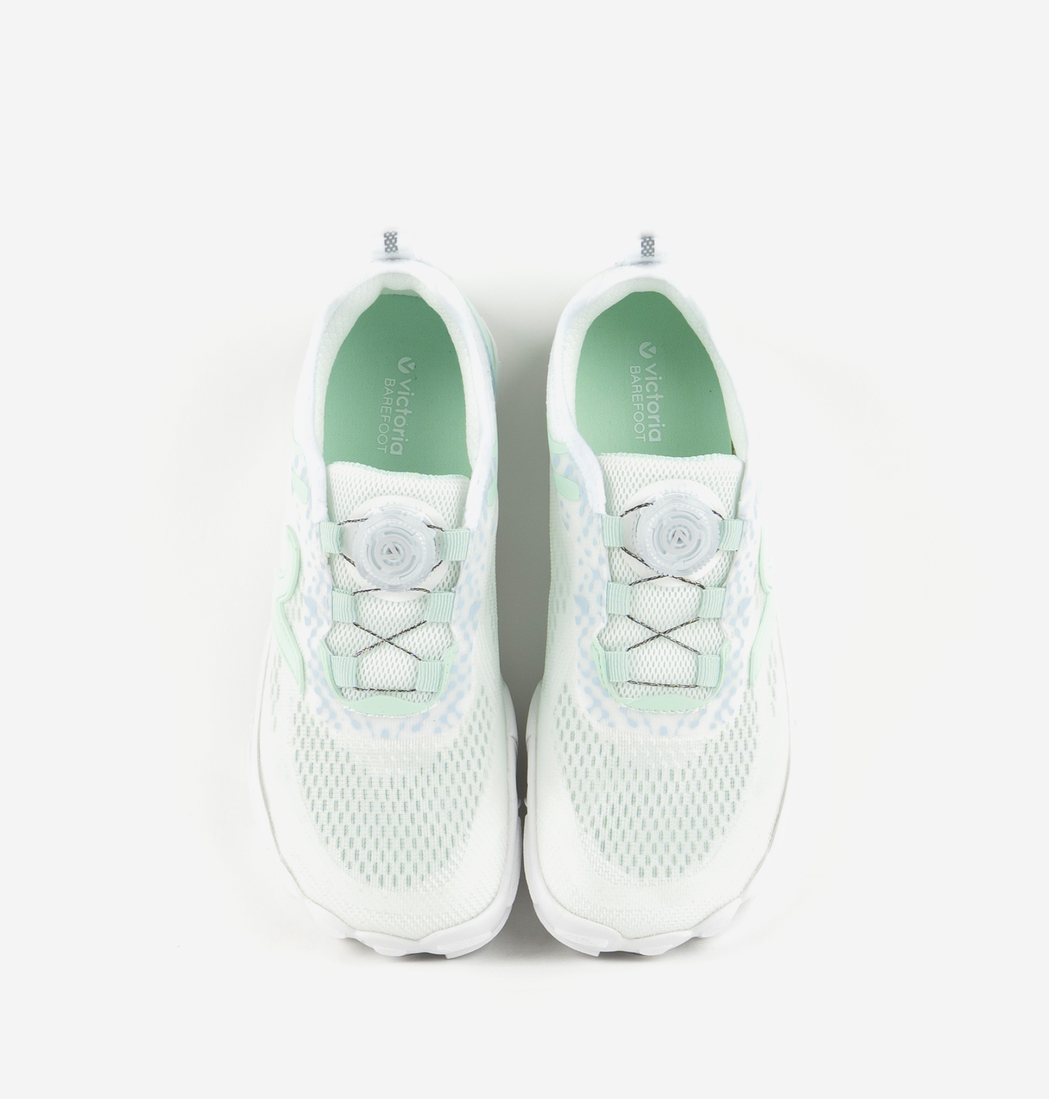 Barefoot trainers for women made from mesh-style fabric. Elastic lace-up fastening with a self-locking system that allows quick and comfortable adjustment without the need for tying. They also feature a back pull tab for easy fitting. Rubber sole with a wavy, voluminous design that provides grip and stability.