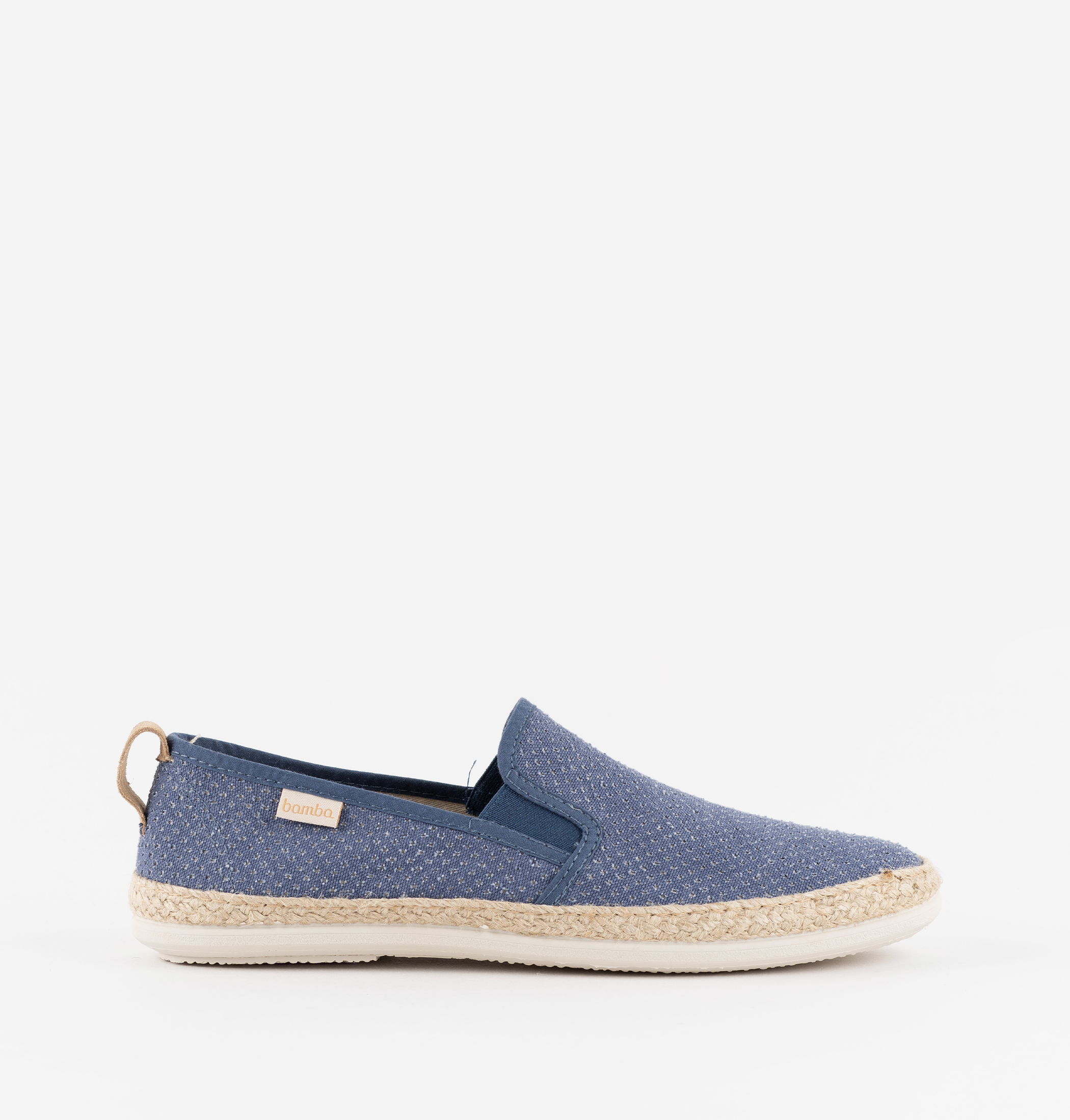Men's espadrilles made in Spain from washed perforated canvas. Featuring two side elastic inserts for added support and comfort. bamba logo label stitched on the side. Also includes a back pull tab for easy fitting. Vulcanised rubber sole with jute braid.
