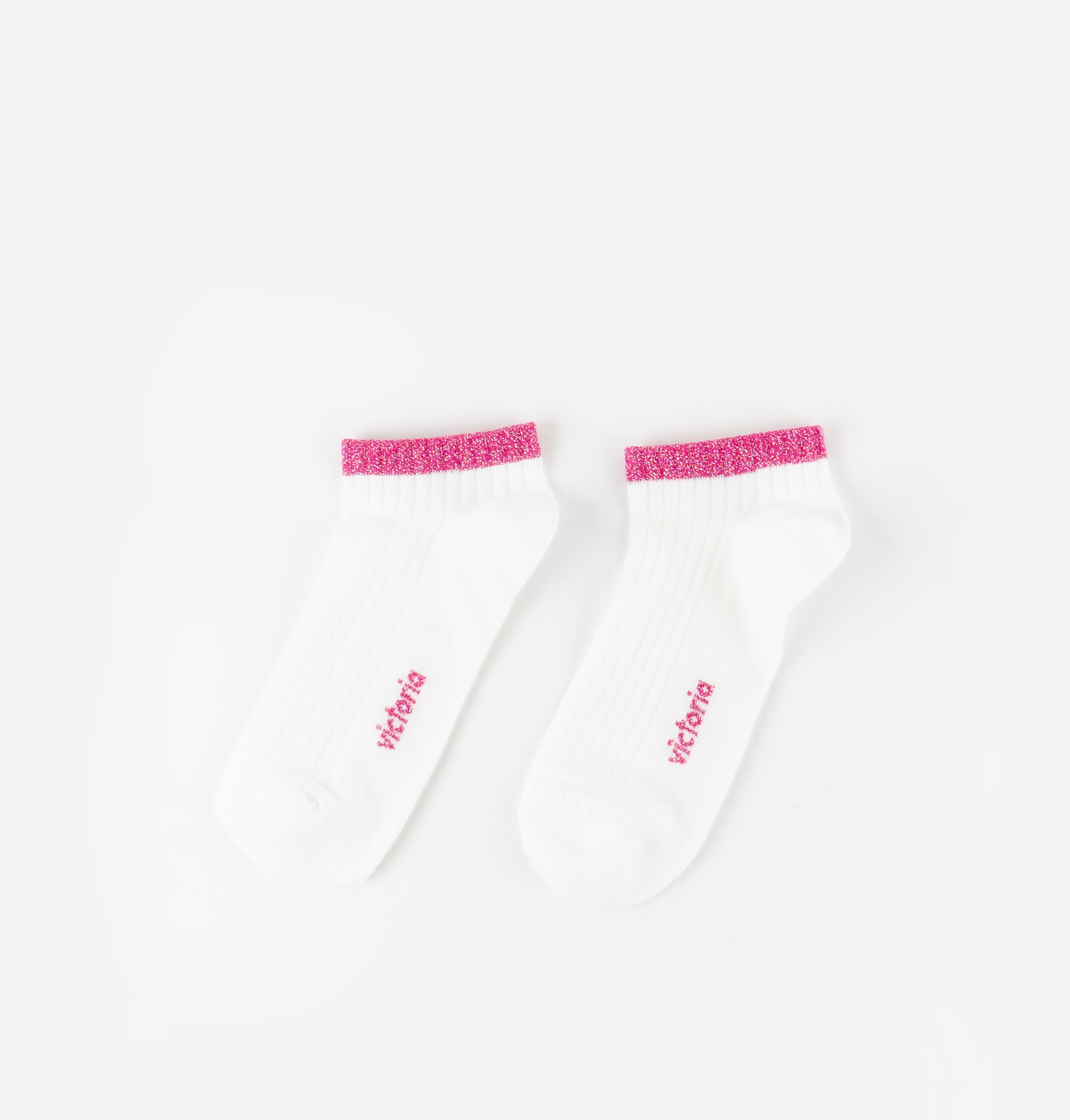 Women's white cotton ankle socks with colorful lurex cuffs. Breathable and adaptable.