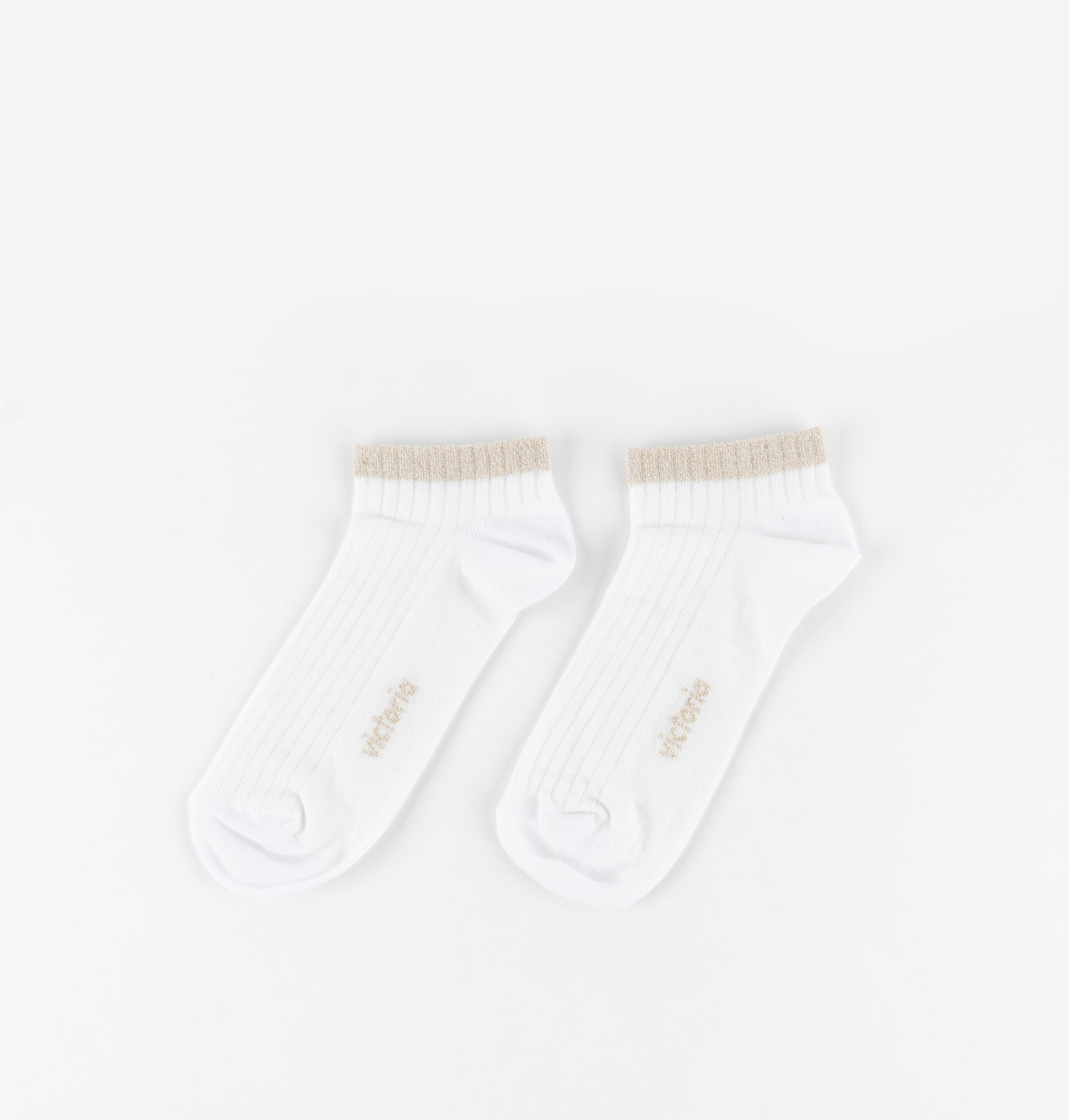 Women's white cotton ankle socks with colorful lurex cuffs. Breathable and adaptable.