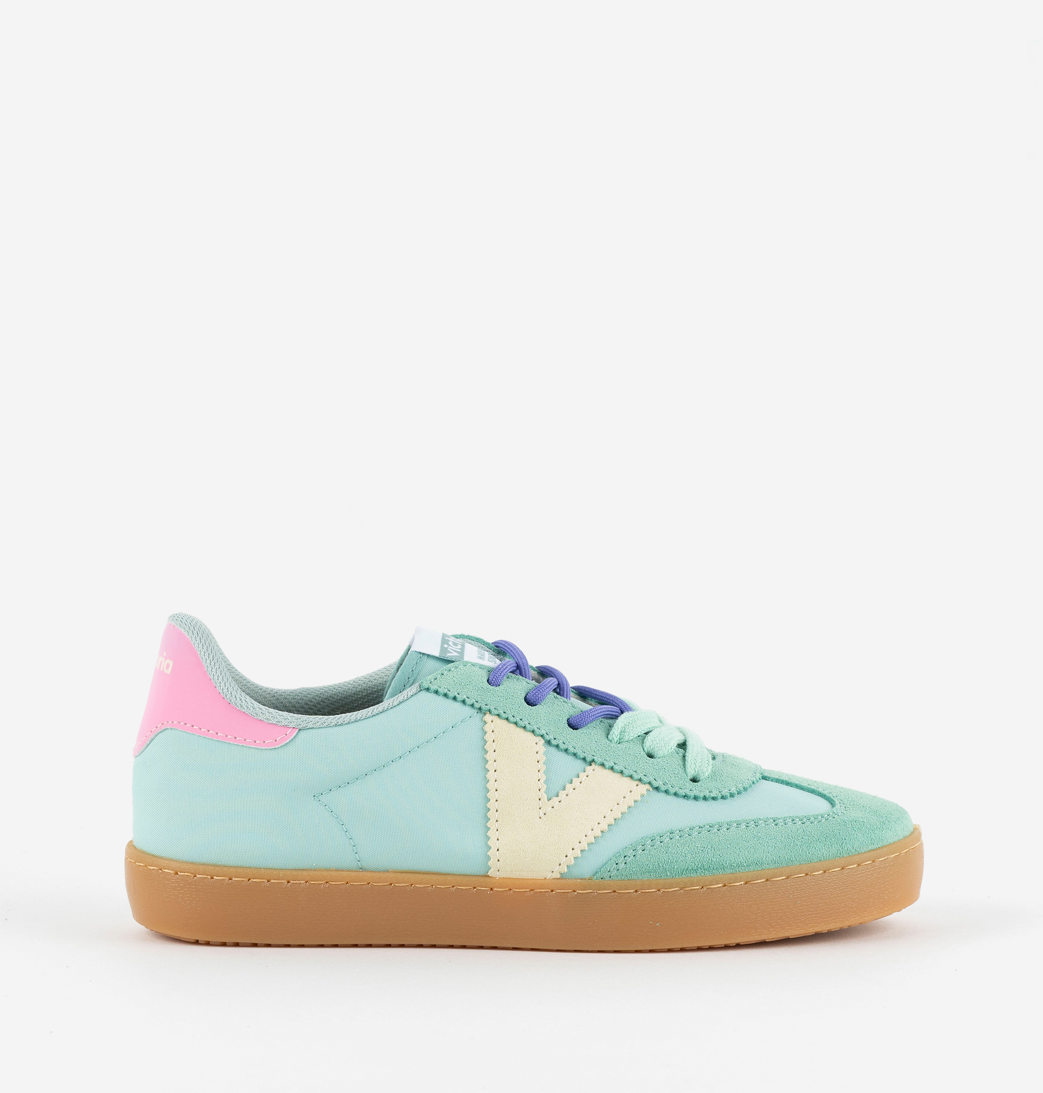 Multicoloured women's trainers made in Spain from nylon with suede panels. Double lace-up fastening: one tonal and one colourful rounded pair. Translucent caramel-coloured T.R. sole.
