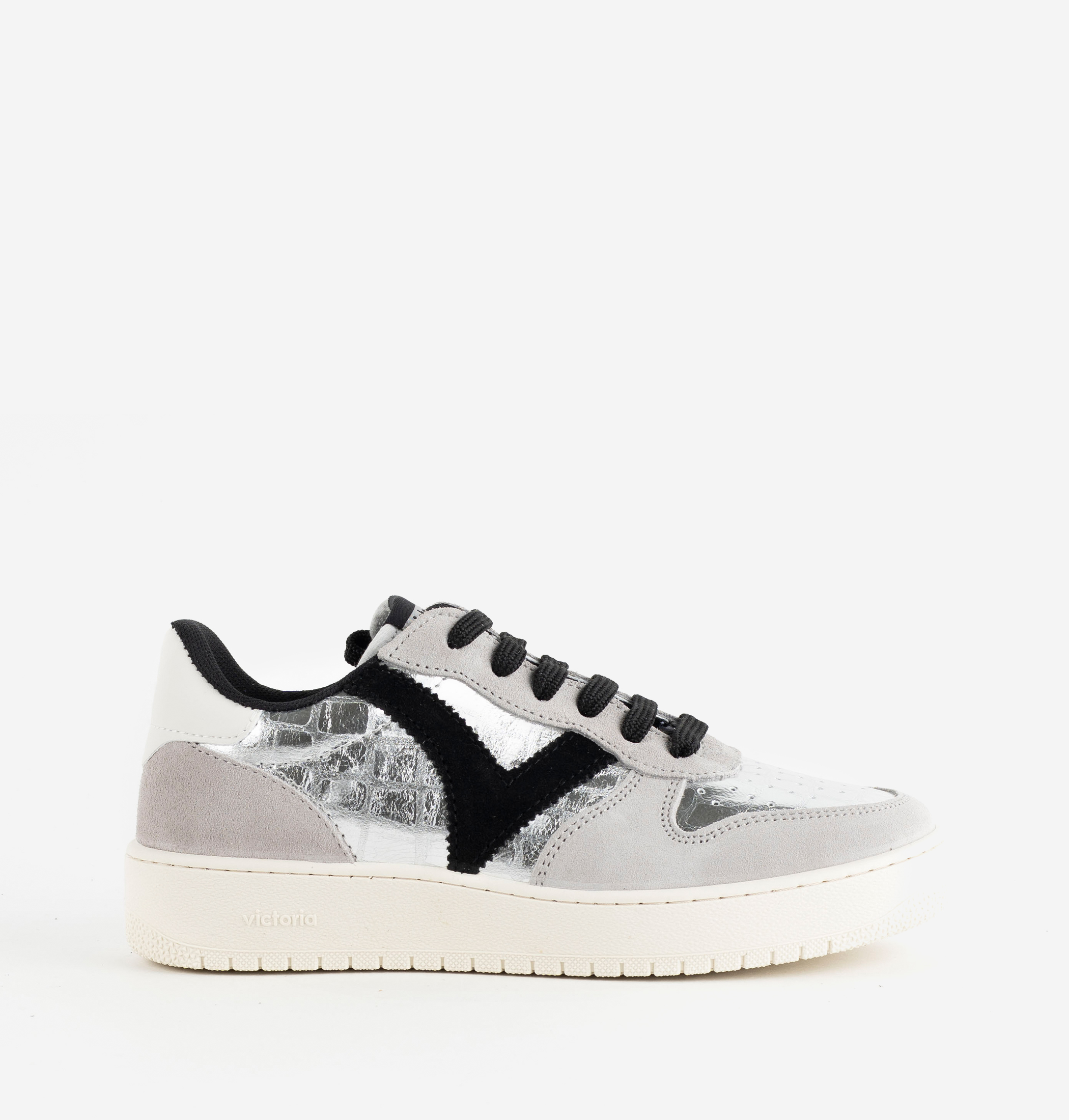 Women's sports sneakers made in Spain from metallic leather-effect material combined with suede and synthetic pieces. Side V and heel piece in contrasting black and white colors. 3 cm sole made with vegetable oils instead of mineral oils, reducing environmental impact. Lightweight, comfortable, and breathable.