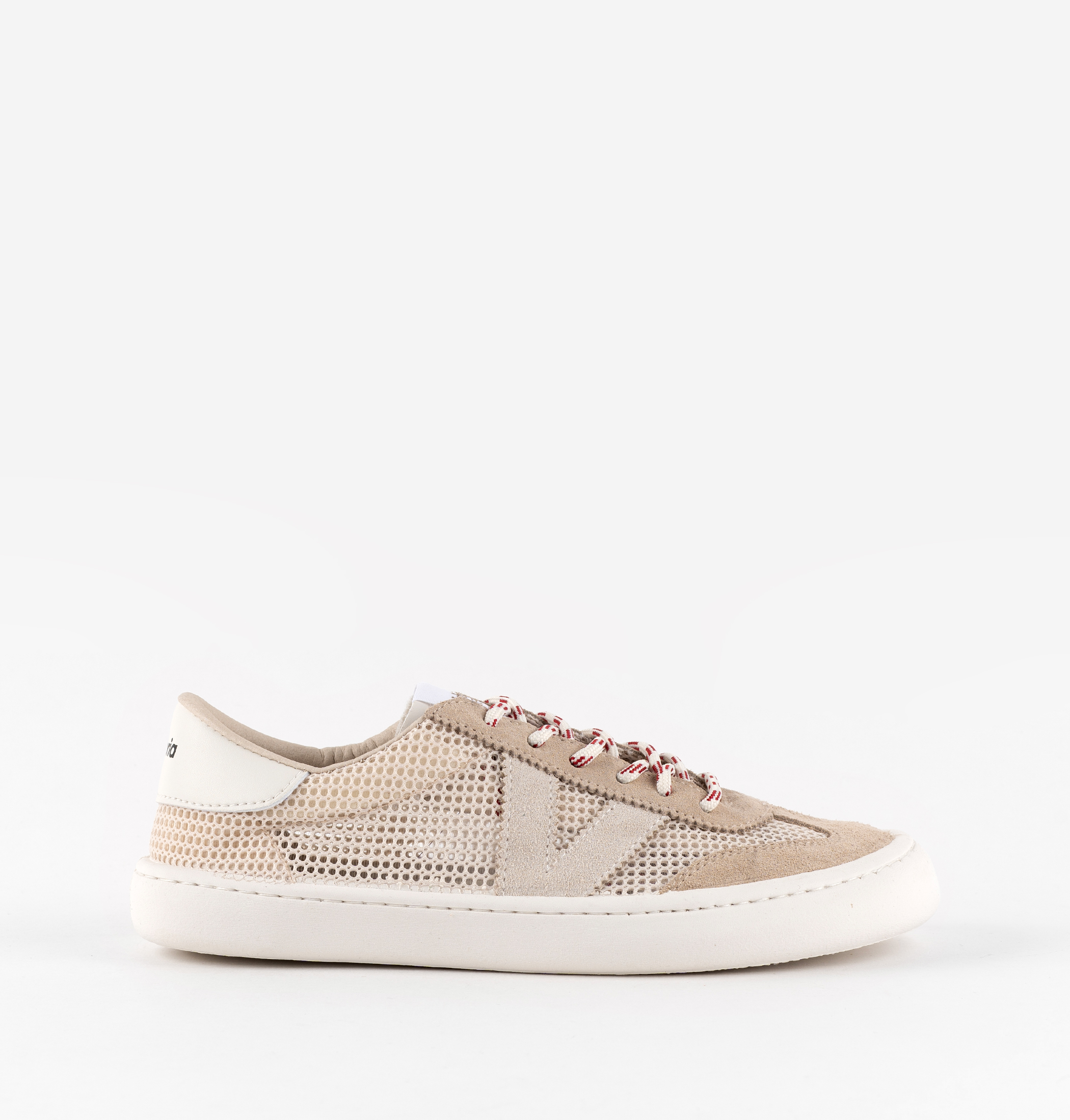 Made in Spain from mesh with tonal suede panels. White faux leather heel panel. White round lace-up fastening with printed detail. Flexible PVC sole made with vegetable oils instead of minerals, helping to reduce environmental impact.