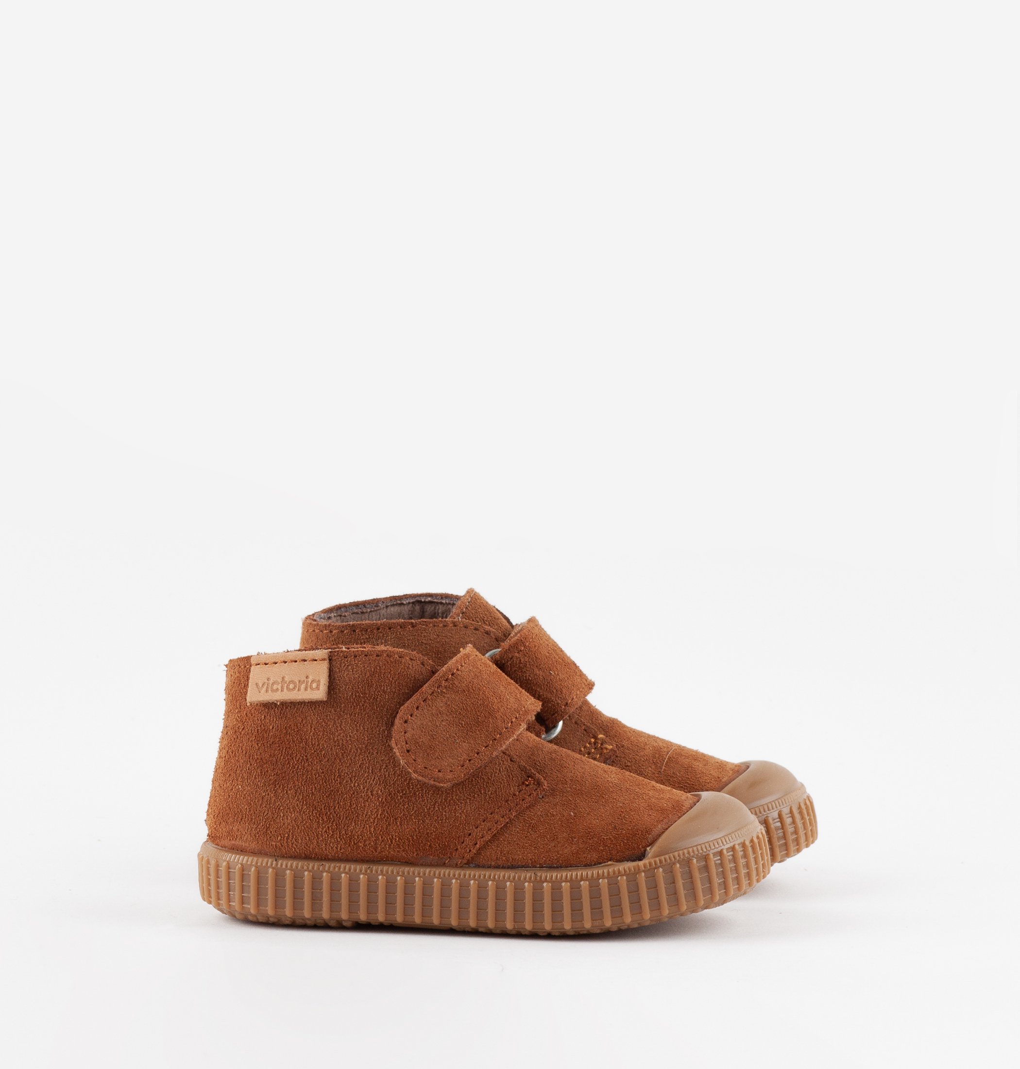 Kids' split leather ankle boots. Made in Spain in high quality, LWG silver rated leather, guaranteeing water, energy and waste have been managed responsibly during the tanning process. Fasten with a strap for the perfect fit against the foot, making them easier to get on and off. Reinforced rubber toe to make them more hard-wearing. They come with a high-density insole for improved comfort.