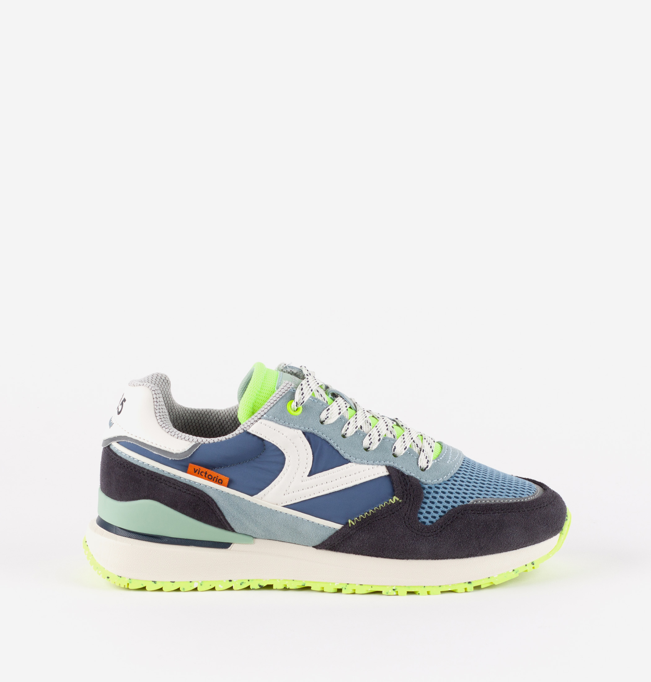 Men's trainers made in nylon with faux split leather and faux leather panels. Textile mesh finish on the upper and tongue. Retro V on the side and neon details. Panel at the back and double heel stabiliser. Embossed rubber outsole with a mottled print, containing recycled materials in its composition. Additionally, they include an ergonomic insole that adapts to the shape of the foot, offering a feeling of comfort.