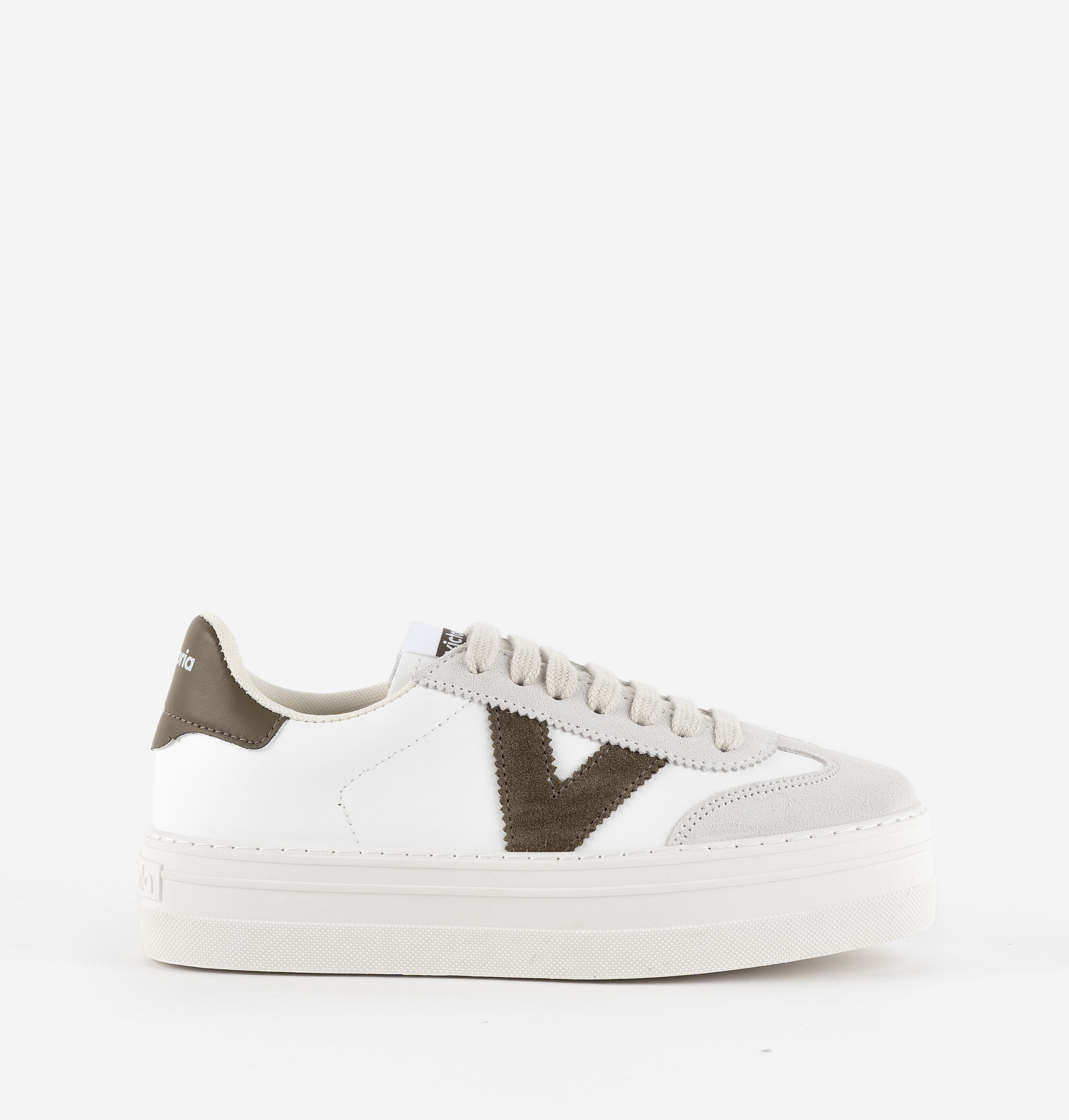 Zapatillas con plataforma para mujer. Fabricadas en España en efecto piel blanca con piezas de serraje (nuevo corte ciclista en la puntera). V de victoria lateral y pieza trasera en colores a juego en contraste. Cómoda suela de PVC de 4 cm elaborada con aceites vegetales en lugar de minerales, reduciendo así el impacto medioambiental.