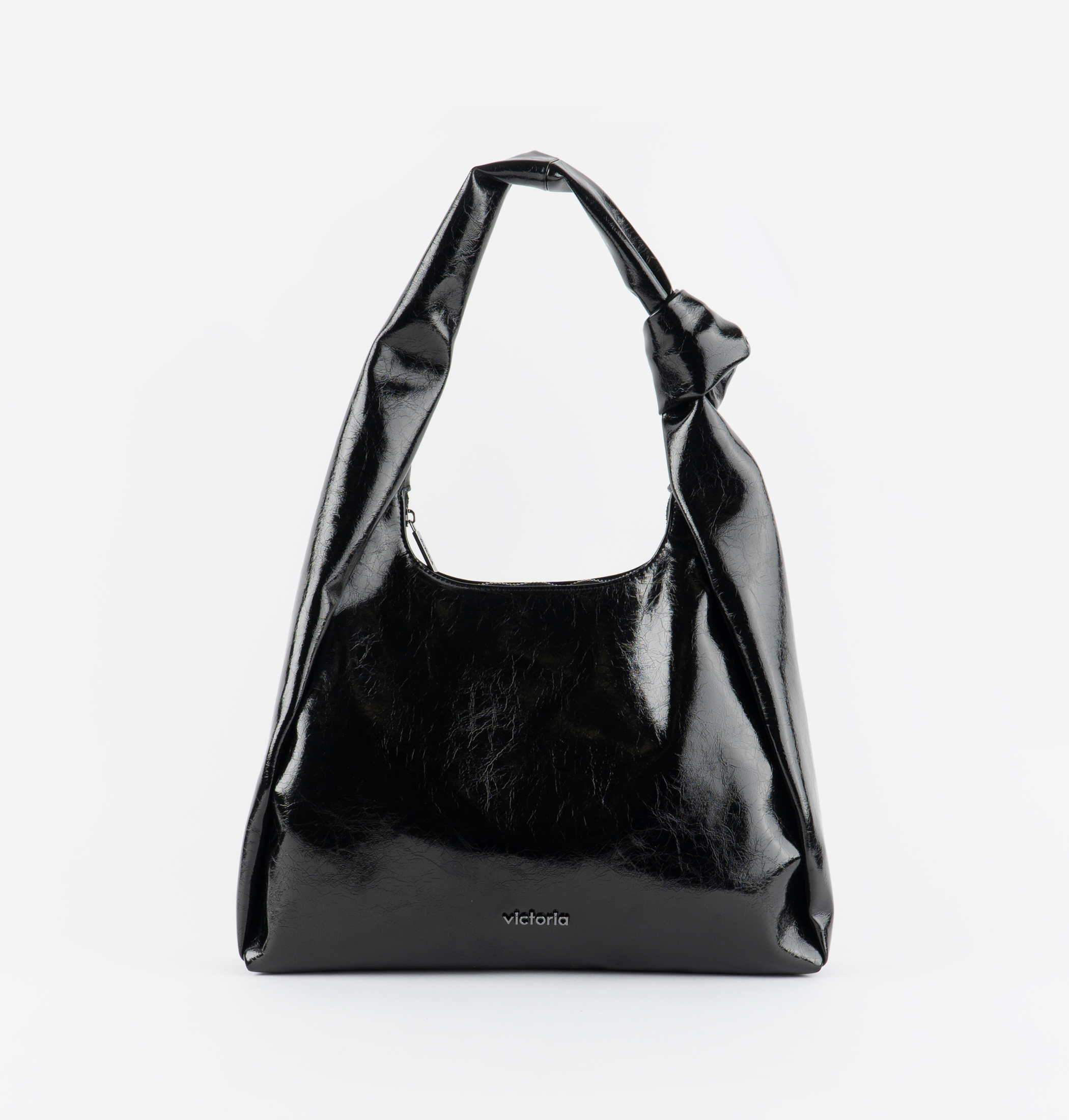 Bolso metalizado con asas de hombro con detalle nudo. Cierre de cremallera con tirador metálico personalizado. Cuenta con doble bolsillo interior, uno de los cuales también se cierra con cremallera. Forro interior al tono. Chapita de marca exterior metálica.