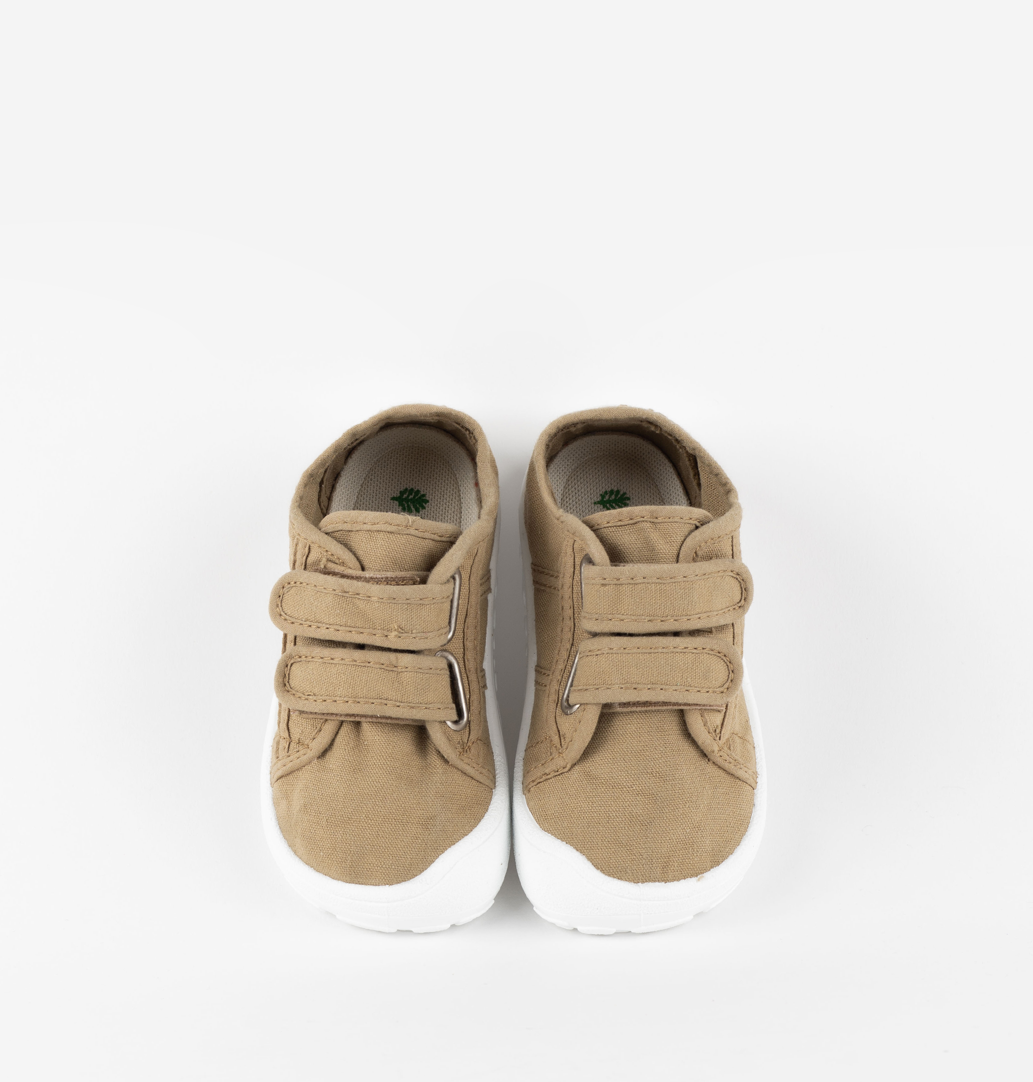Zapatillas de lona barefoot para niños fabricadas en una combinación de algodón reciclado DREC® (Dyeable Recycled Eco Cotton) y algodón ecológico cultivado, hilado y tejido en España. Cierre con dos tiras adherentes, que aportan mayor sujección y facilitan el calce, fomentando su autonomía. Suela blanca de TR Flexible.