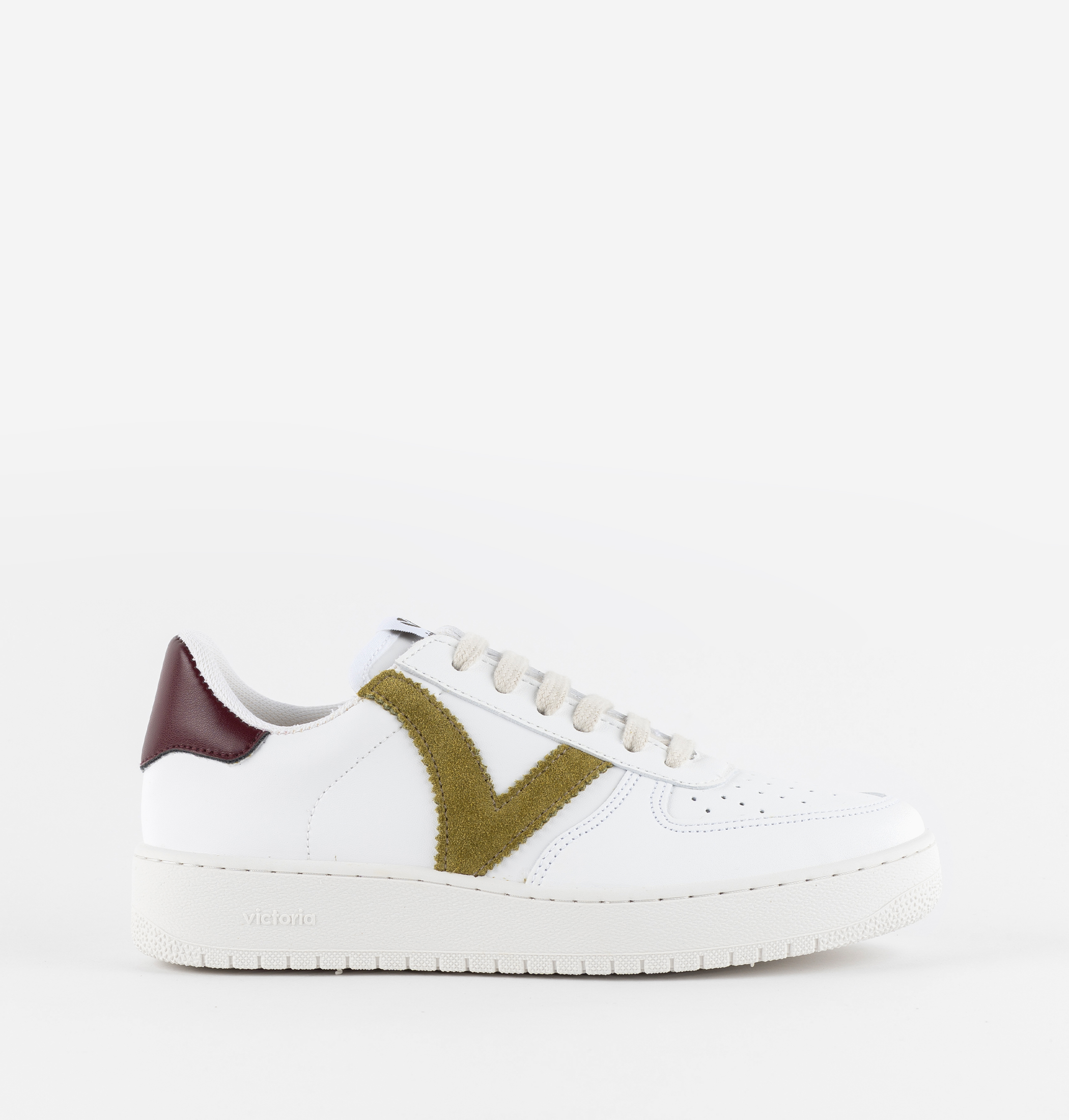 Zapatillas deportivas unisex fabricadas en España en efecto piel blanca. Detalles de color en la V de victoria lateral y la pieza trasera. Puntera perforada para favorecer la transpiración. Suela de PVC con relleno reciclado.