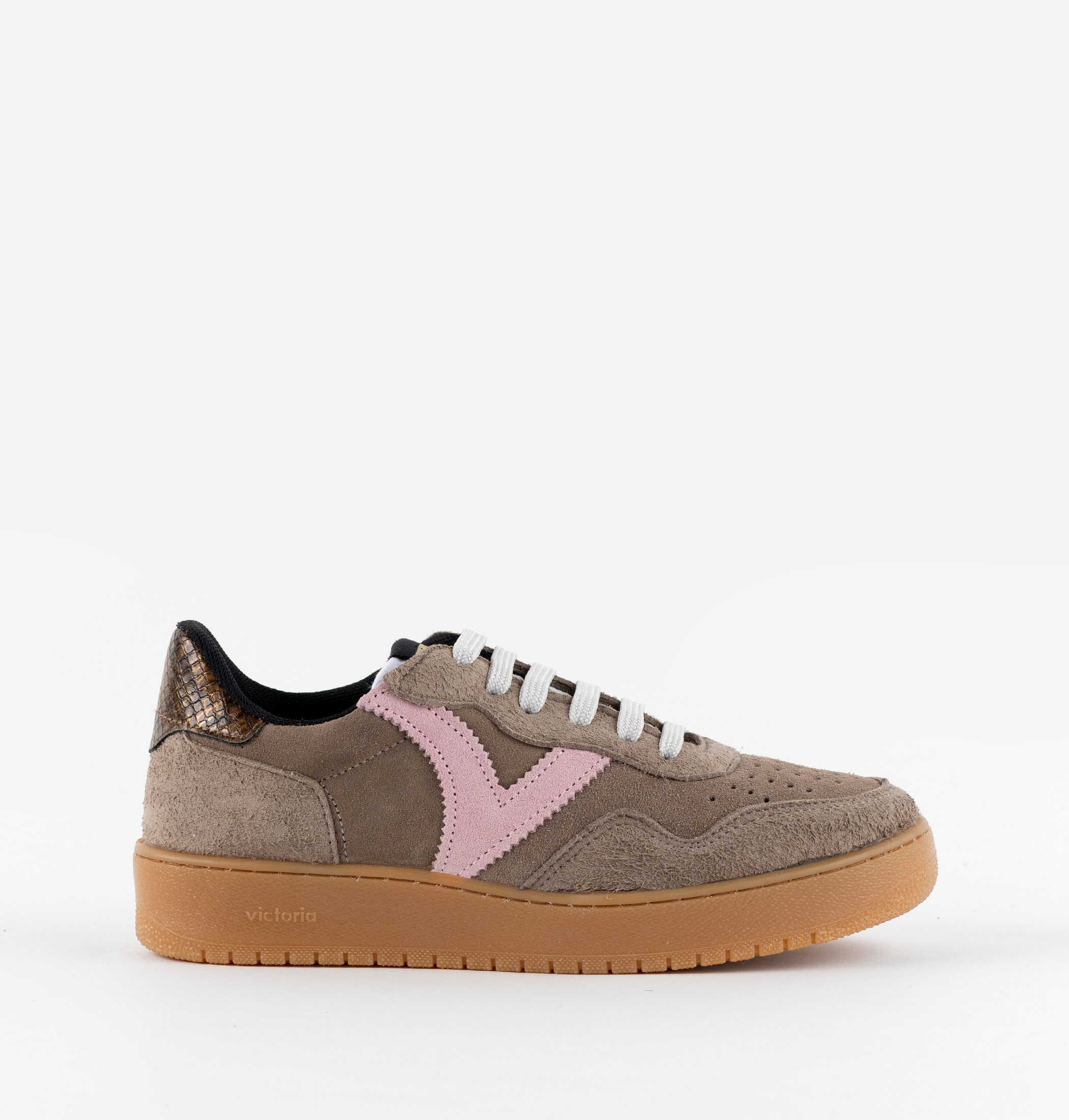 V latérale rose et pièce arrière à motif animal. Semelle couleur caramel de 3 cm composée d'huiles végétales plutôt que minérales, réduisant ainsi l'impact environnemental.