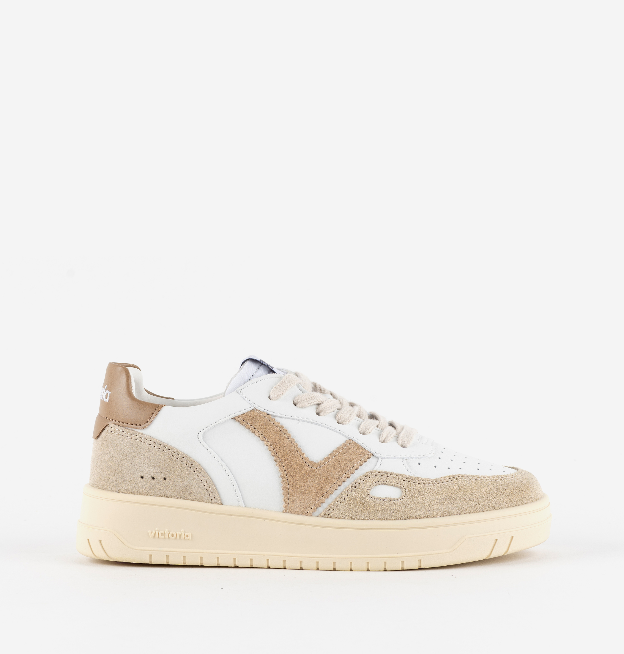 Baskets sport unisexe fabriquées en effet cuir blanc avec des pièces colorées et en daim. La V de victoria latérale et la pièce arrière avec le logo de la marque contrastent dans des couleurs assorties. Détail en forme de fenêtre sur le côté. Pointe perforée pour favoriser la respirabilité. Semelle en TPR légèrement ambrée.
