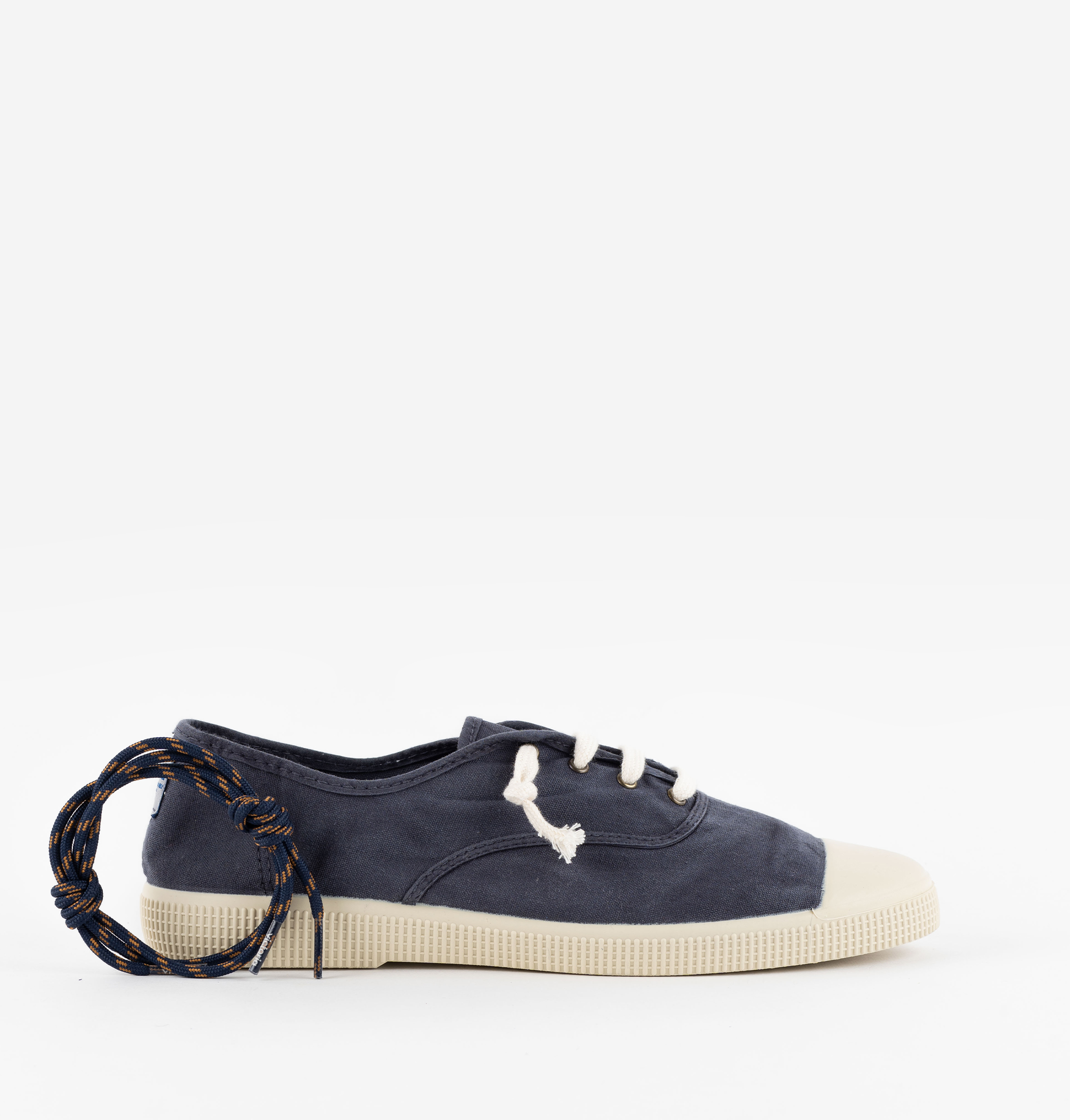 Estas sapatilhas de lona para mulher e homem são fabricadas numa combinação única de algodão reciclado DREC® (Dyeable Recycled Eco Cotton) e algodão ecológico cultivado, fiado e tecido em Espanha. Apresentam um ligeiro efeito envelhecido. Incorporam fecho com cordões em cru e incluem um segundo par redondo com estampado. Confortável sola de borracha vulcanizada com reforço na biqueira, para maior resistência e durabilidade.