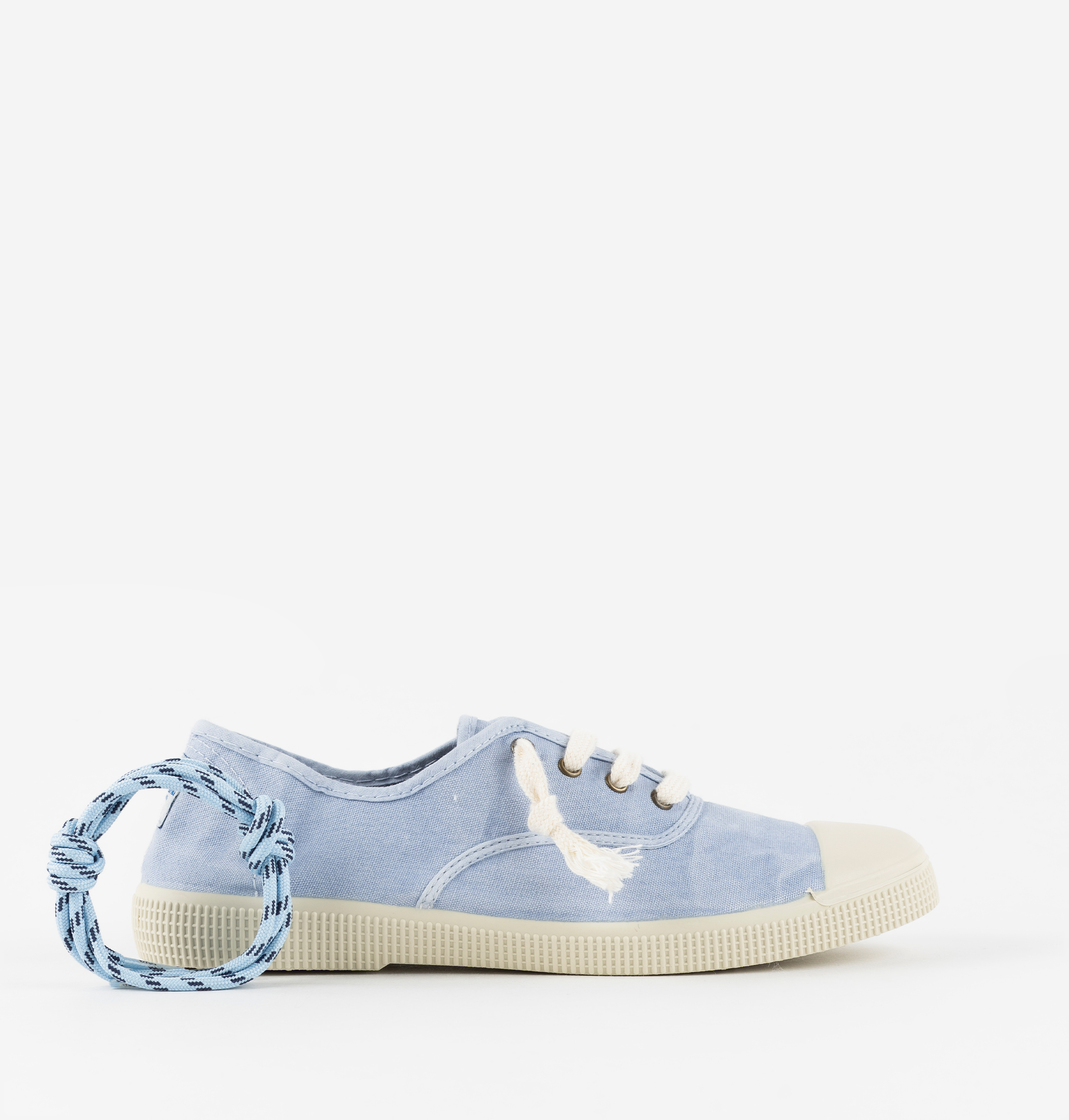 Estas sapatilhas de lona para mulher e homem são fabricadas numa combinação única de algodão reciclado DREC® (Dyeable Recycled Eco Cotton) e algodão ecológico cultivado, fiado e tecido em Espanha. Apresentam um ligeiro efeito envelhecido. Incorporam fecho com cordões em cru e incluem um segundo par redondo com estampado. Confortável sola de borracha vulcanizada com reforço na biqueira, para maior resistência e durabilidade.