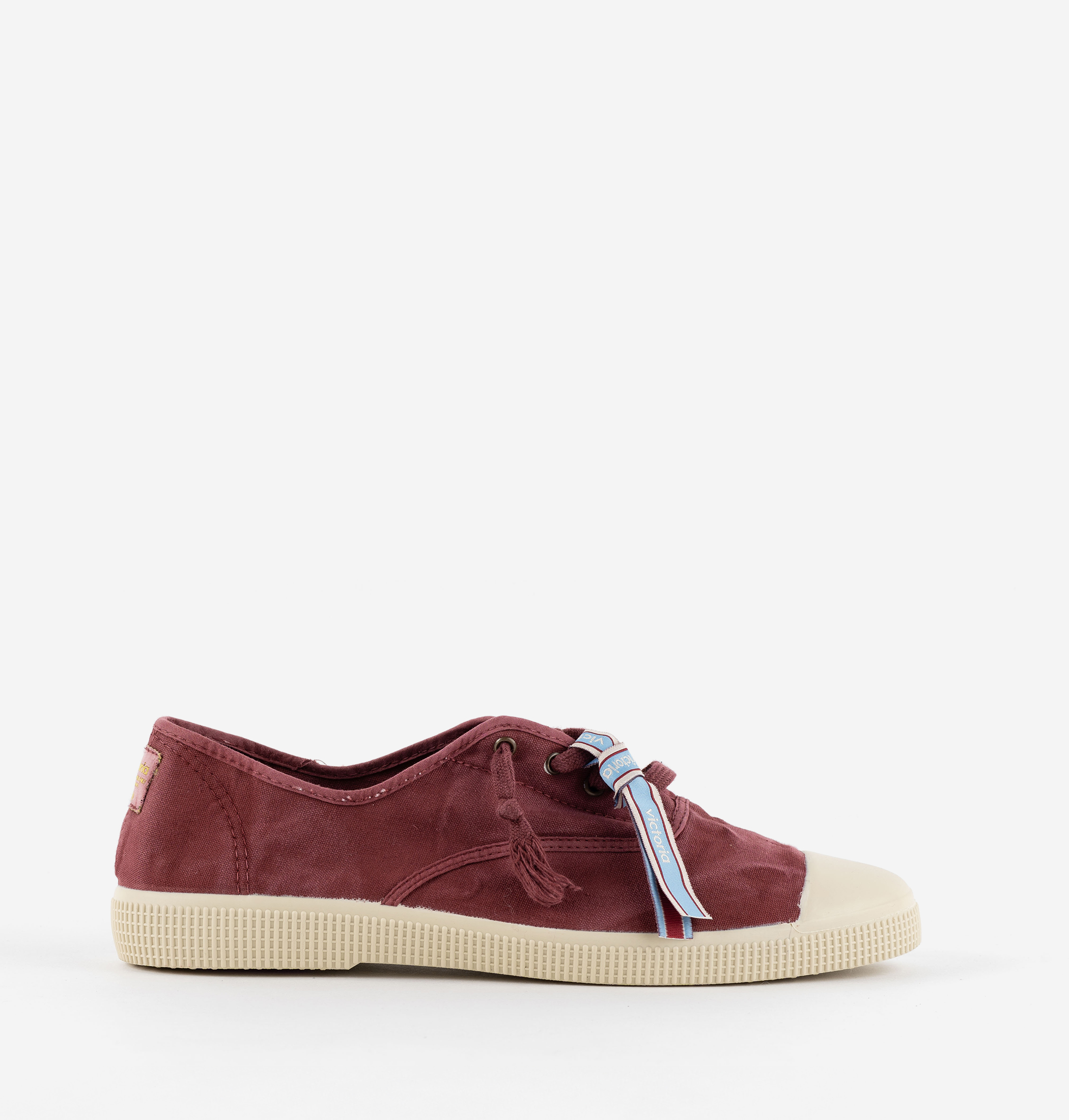 Estas sapatilhas de lona para mulher e homem são fabricadas numa combinação única de algodão reciclado DREC® (Dyeable Recycled Eco Cotton) e algodão ecológico cultivado, fiado e tecido em Espanha. Apresentam um ligeiro efeito envelhecido. Incorporam fecho com cordões a condizer e incluem como acessório uma pulseira tipo festival com o logótipo da victoria. Confortável sola de borracha vulcanizada com reforço na biqueira, para maior resistência e durabilidade.