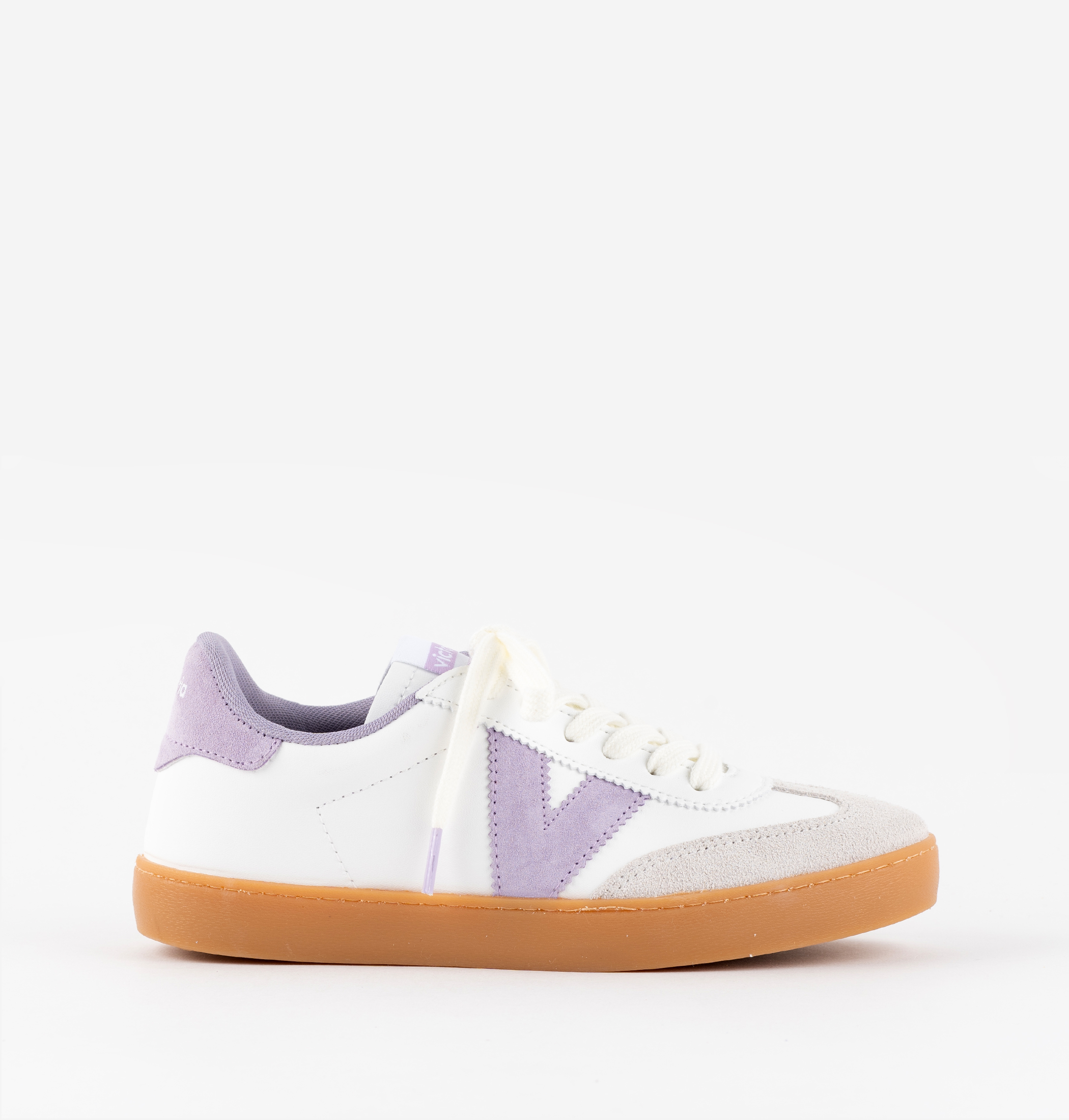 Sapatilhas para mulher fabricadas em Espanha em efeito pele branca com peças em camurça. V lateral da victoria, forro e peça traseira em cores a condizer em contraste. Sola de T.R. translúcido cor caramelo.