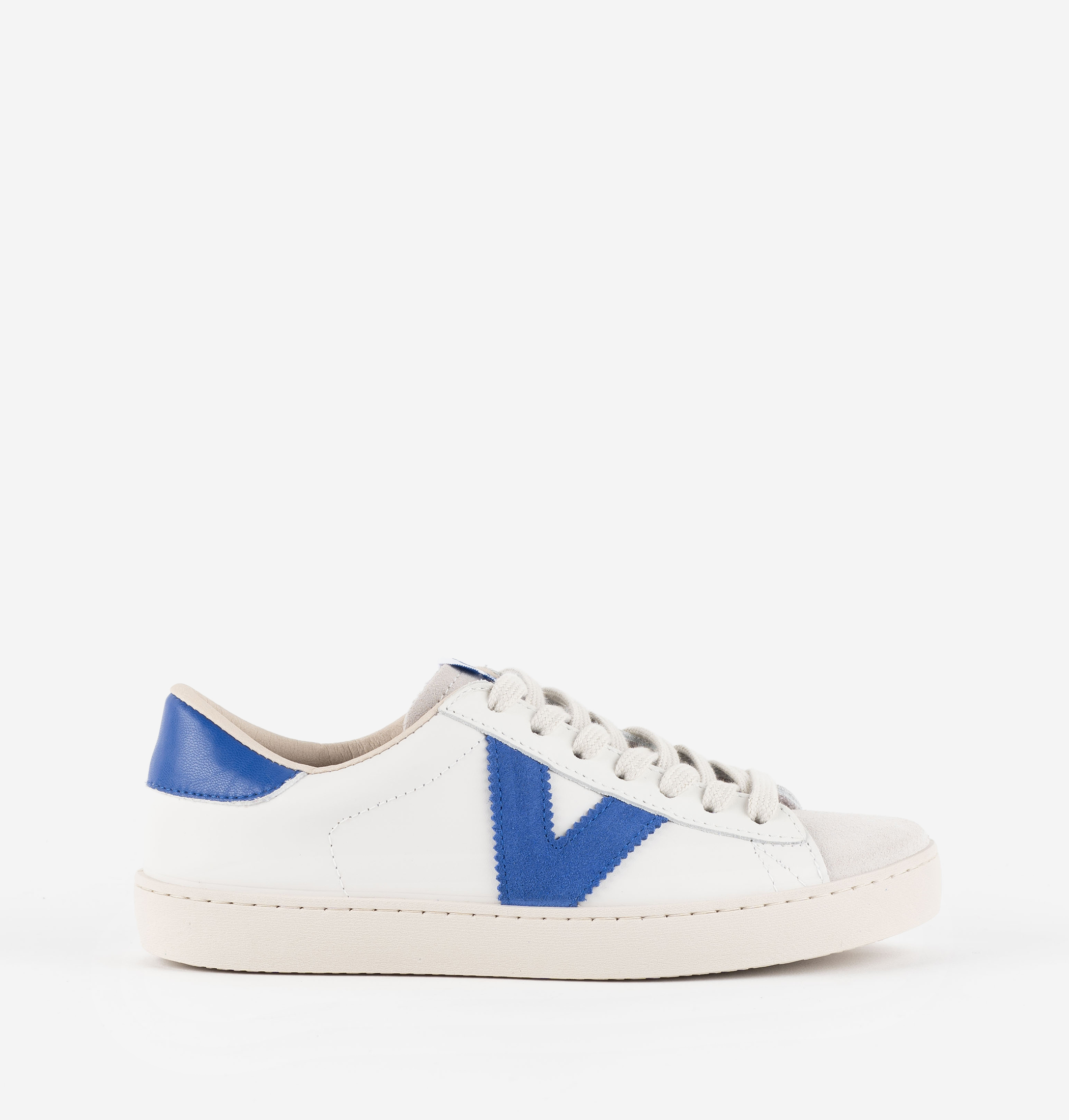 Sapatilhas brancas unisexo fabricadas em Espanha em pele macia de alta qualidade. V lateral da victoria e peça traseira em cores a condizer em contraste. Biqueira em camurça. Sola em PVC ligeiramente tostada elaborada com óleos vegetais em vez de minerais, reduzindo assim o impacto ambiental.